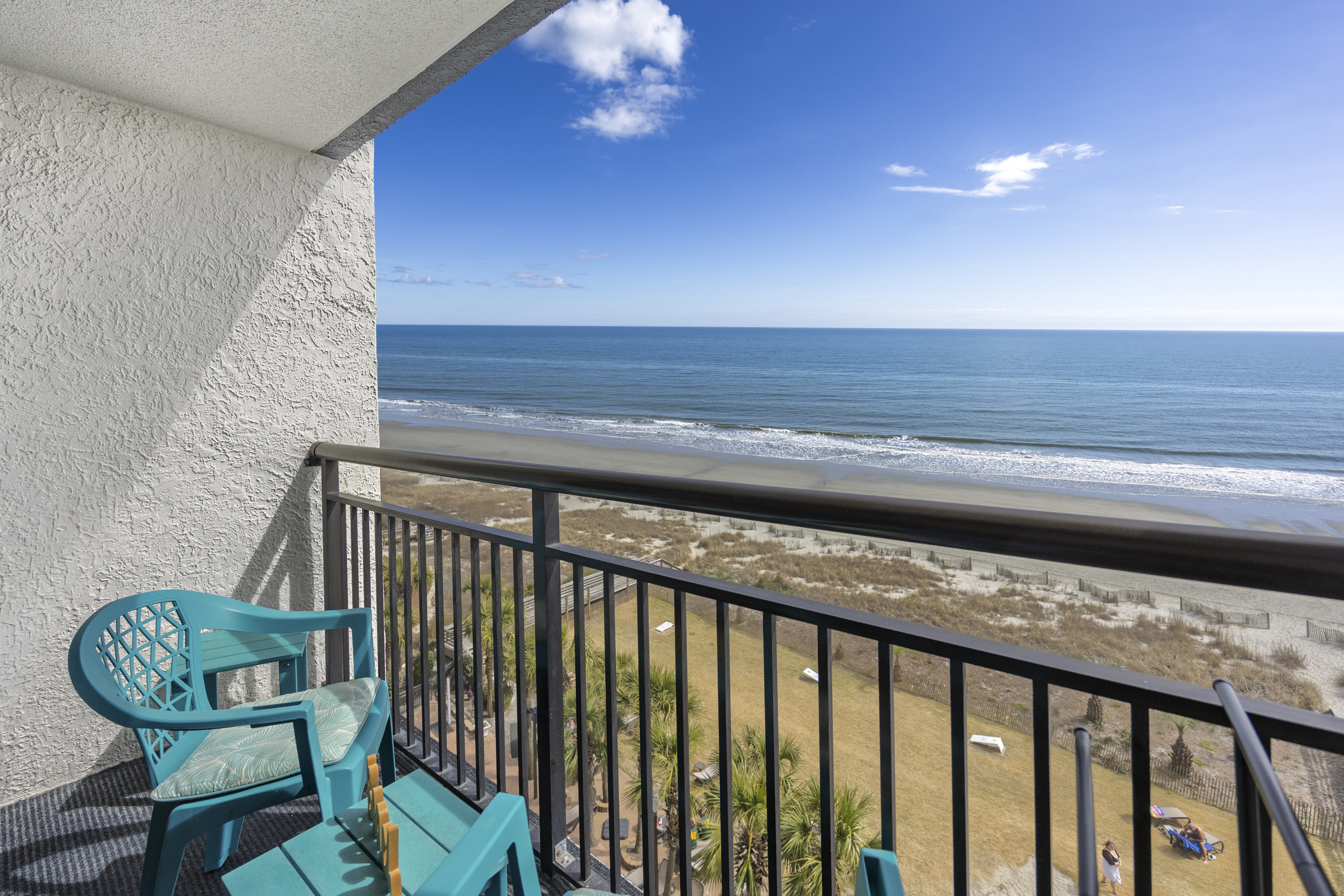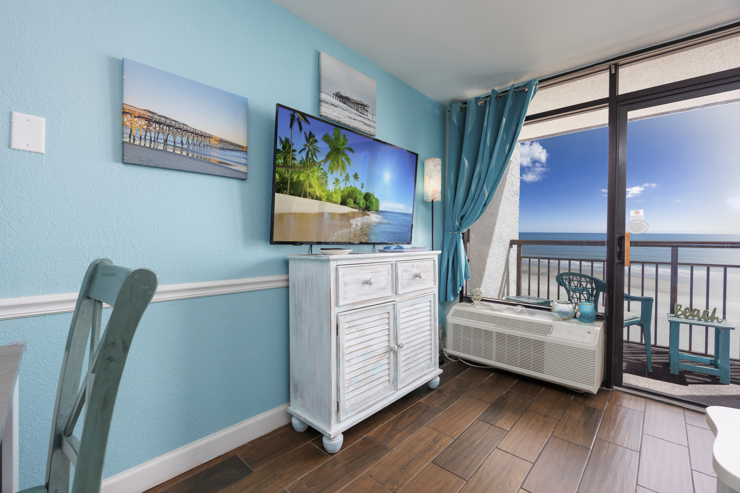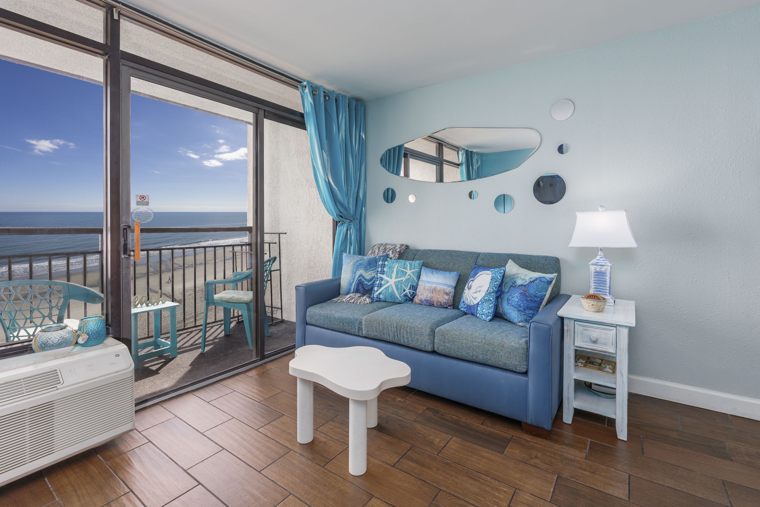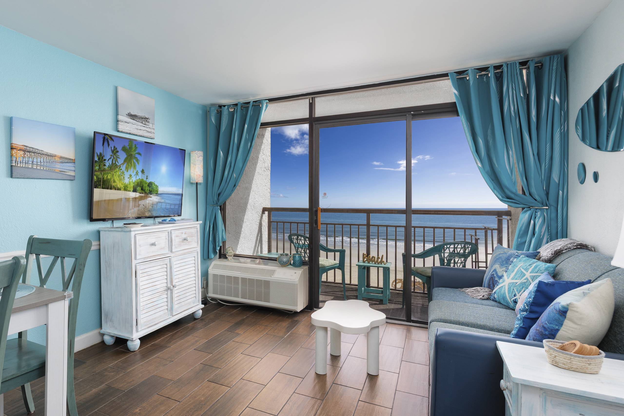 Welcome to Harmony’s Ocean Haven, your beach getaway! From the moment you step inside, you're greeted by breathtaking ocean views that set the tone for a relaxing stay. The condo is decorated in soothing coastal blues and teals that bring the calm of the sea indoors. All the artwork in the unit is our very own original photography — if you fall in love with any of the pieces, let us know… you’ll seriously make our day! LIVING ROOM The bright and welcoming living room offers floor-to-ceiling ocean views and a front-row seat to the ever-changing seascape. You'll find a full-size Murphy bed, an elegant dining area, and a comfortable couch and chair to sink into after a day of sun and surf. Whether you're enjoying a movie on the 55” smart TV or debating whether to sneak in one more beach day, this space makes it easy to relax and unwind. KITCHEN The fully stocked kitchen has everything you need to prepare your meals, whether you're cooking a fresh seafood dinner or just mastering the art of vacation pancakes. With the ocean just outside the window, even doing the dishes might feel a little more enjoyable. You’ll find a refrigerator with icemaker, stove, microwave, drip/Keurig combo coffee maker, toaster, and plenty of pots, pans, cooking utensils, plates, cups, and glasses. We also provide a starter supply of paper towels, dish soap, dish towels, and trash bags, and you’ll often find basic cooking supplies that our kind guests leave behind for others. BEDROOM The private bedroom is the perfect place to rest after a day of sun and sand, with two comfortable queen beds, a 55” smart TV with cable, dresser, and closet. We provide a dehumidifier to keep things cool and comfortable through the night. BATHROOM The updated bathroom includes a bathtub/shower combination with a dual handheld massage shower and a separate vanity area to make getting ready in the mornings a little easier. We supply a hairdryer, a starter set of toilet paper and toiletries, and two sets of towels per guest. BALCONY Step out onto your private sixth-floor balcony — a perfect place to sip your morning coffee, enjoy a quiet dinner, watch dolphins and surfers, or simply take in the ocean breeze. It’s a favorite spot for unwinding… or even imagining your new life as a full-time beach bum. The balcony is furnished with a pair of comfortable chairs and small tables, along with a drying rack for beach towels and swimsuits. BEACH GEAR You’ll find several beach essentials in the bedroom closet, including boogie boards, a cooler, a couple of beach chairs, beach toys, and an umbrella. There is also a selection of books, toys, and games in the living room cabinet for those occasional rainy days. Many of our guests prefer to bring their own pool/beach towels, but if you prefer to pack light, pool/beach towels are available to rent for $10 per towel for the duration of your stay. Just let us know and we will have them ready for you upon your arrival. RESORT AMENITIES Plentiful resort amenities include direct beach access, an oceanfront lawn with lounge chairs and games, indoor and outdoor heated pools, a heated lazy river, and three hot tubs. Don’t miss the recently renovated rooftop pool with beautiful sunset city views. The poolside Surf Shack offers seasonal refreshments and snacks, so you can grab a bite without leaving your lounge chair. Additional conveniences include soda and snack machines, a vending area, a fitness room with oceanfront views, a laundry facility, and free onsite parking just steps from the condo. The resort also provides onsite security and security cameras throughout the common areas. THE HARMONY’S OCEAN HAVEN DIFFERENCE This is my home too during the winter, and I want it to be as comfortable and welcoming for you as it is for me. Every detail has been thoughtfully considered to help you relax, unwind, and enjoy your time at the beach — I’ve done my best to think of just about every necessity that could possibly fit in the condo (and a few that probably shouldn’t! The condo is professionally managed, and as the owner, I stay closely involved to ensure everything is taken care of. Professional cleaning and restocking are completed after each stay, along with frequent quality control inspections. Monthly preventive pest control and annual bed bug treatments are provided by Beach Pest Service. PTAC units and smoke detectors are inspected and serviced annually, along with routine deep cleaning and preventive maintenance. I also make ongoing updates and improvements throughout the year to ensure the space stays fresh, comfortable, and guest-ready. I’m committed to clear and responsive communication throughout your stay. I look forward to welcoming you at Harmony’s Ocean Haven!