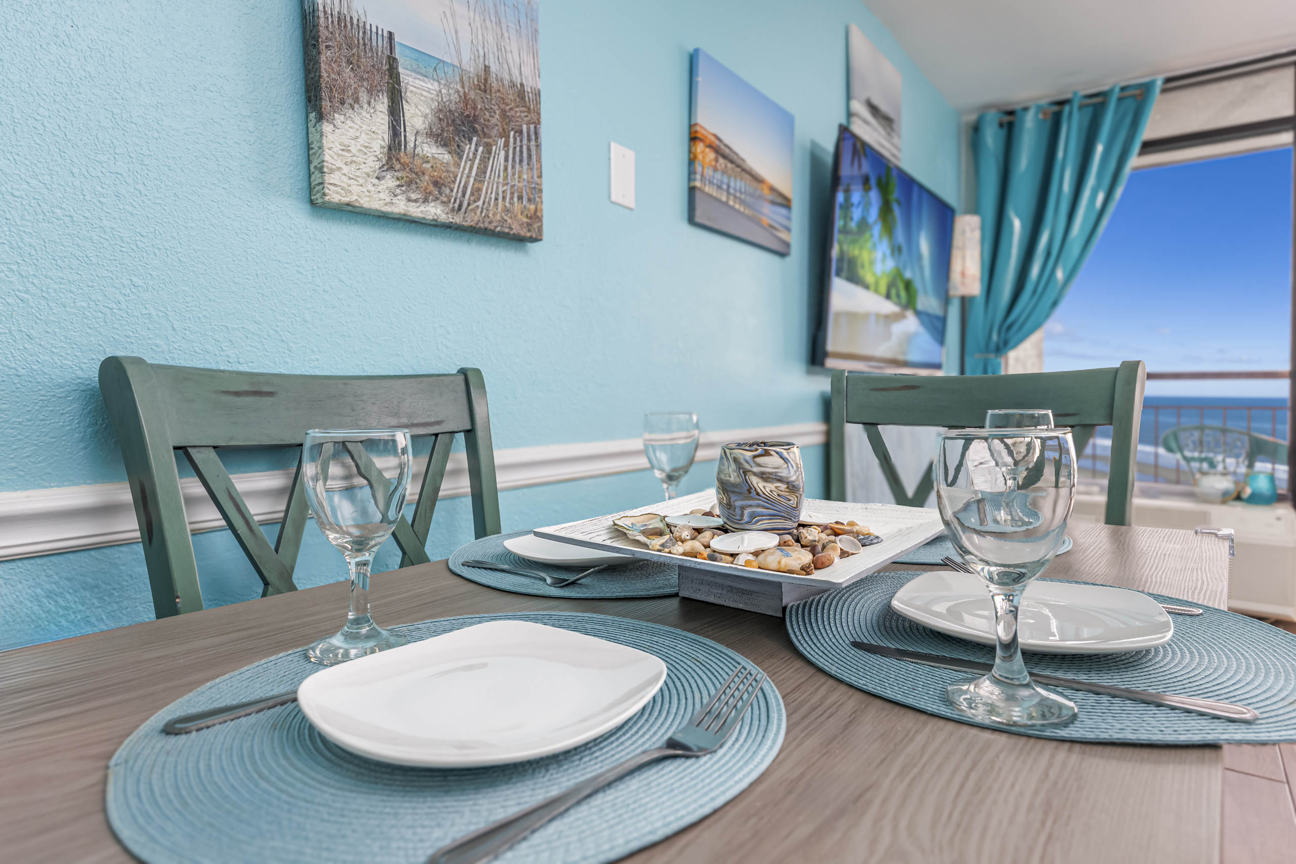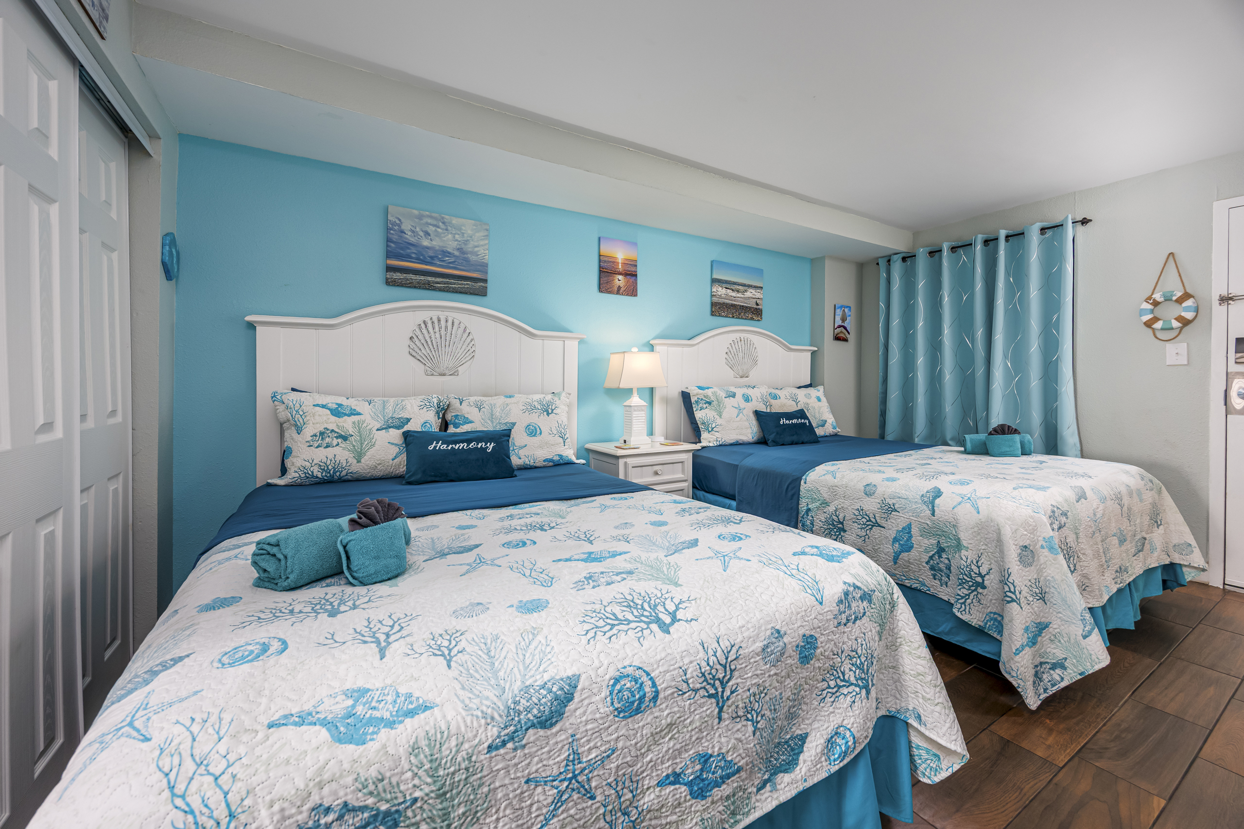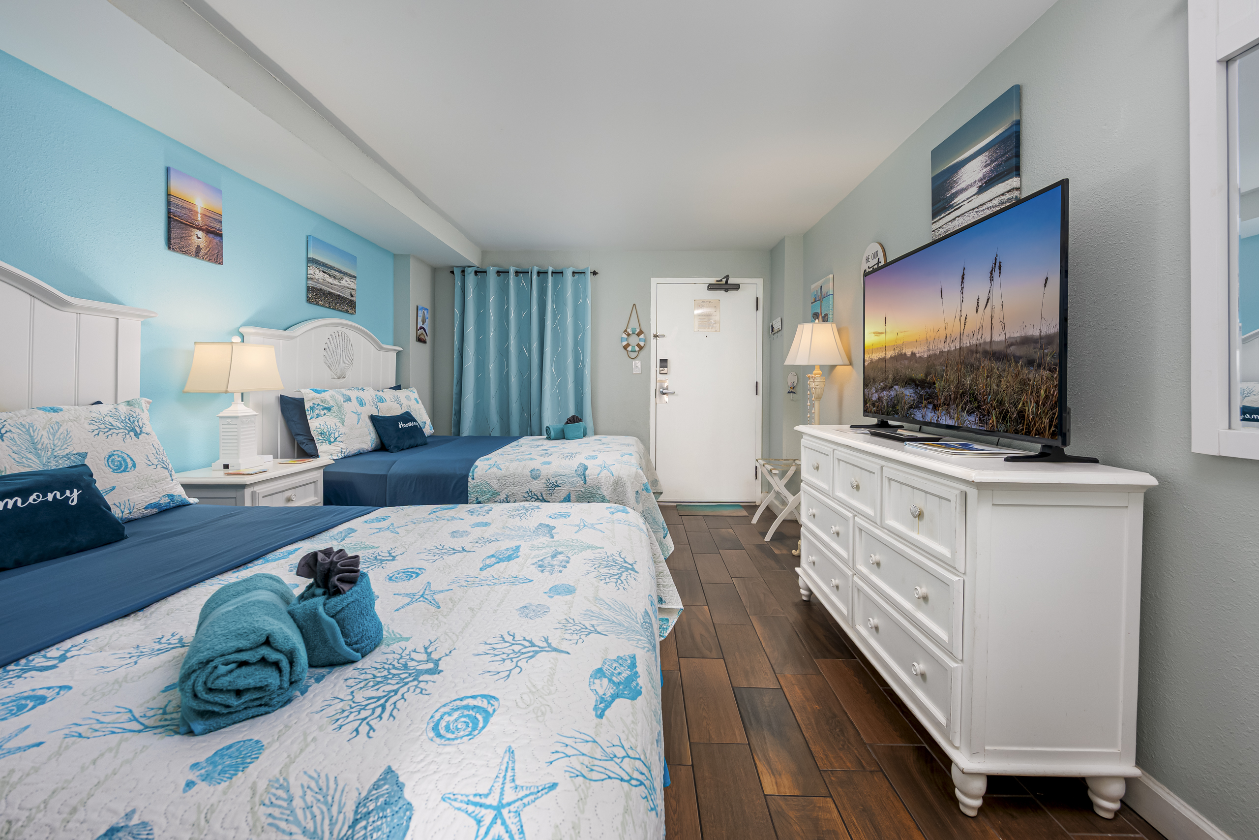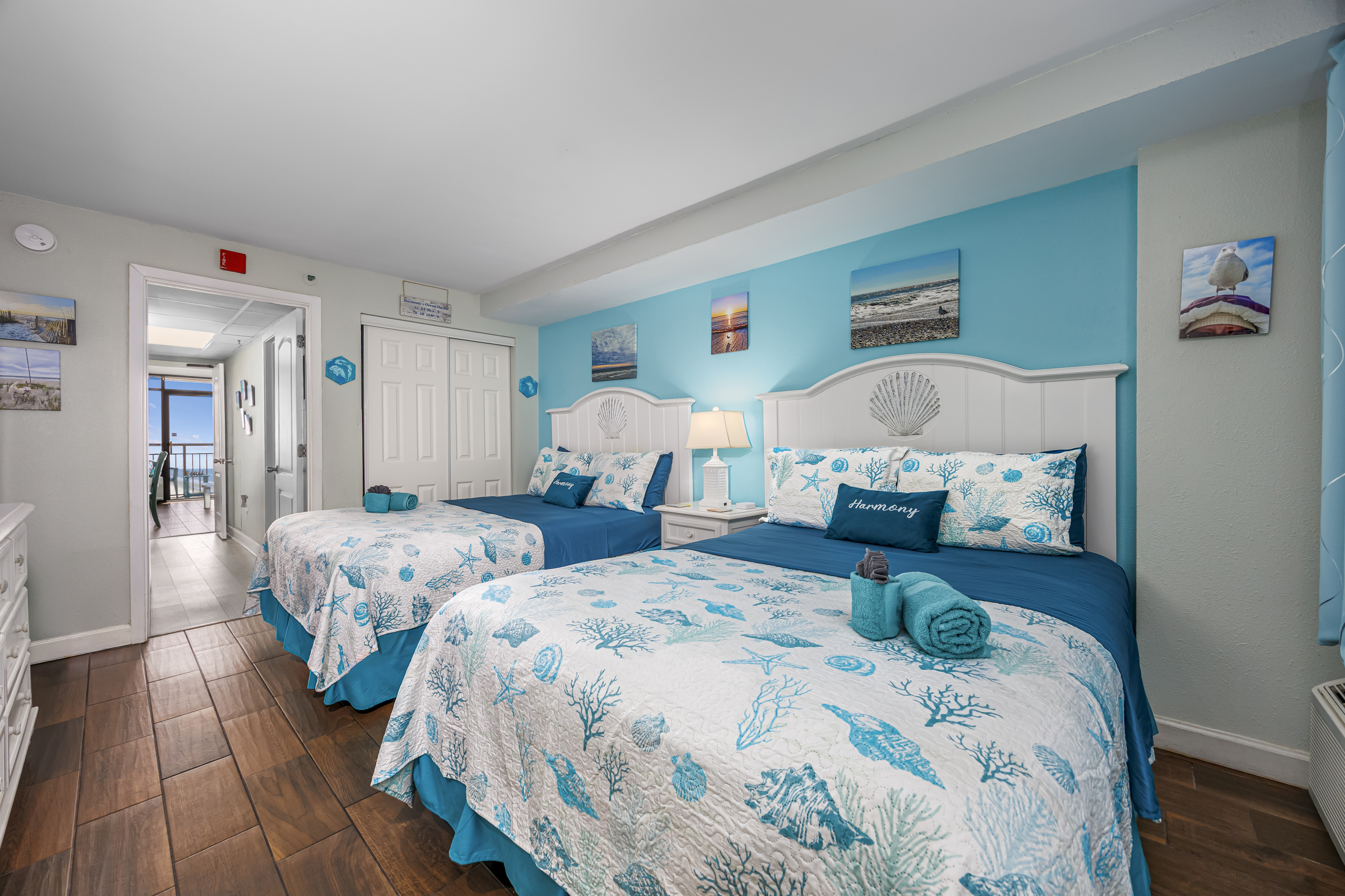 Welcome to Harmony’s Ocean Haven, your beach getaway! From the moment you step inside, you're greeted by breathtaking ocean views that set the tone for a relaxing stay. The condo is decorated in soothing coastal blues and teals that bring the calm of the sea indoors. All the artwork in the unit is our very own original photography — if you fall in love with any of the pieces, let us know… you’ll seriously make our day! LIVING ROOM The bright and welcoming living room offers floor-to-ceiling ocean views and a front-row seat to the ever-changing seascape. You'll find a full-size Murphy bed, an elegant dining area, and a comfortable couch and chair to sink into after a day of sun and surf. Whether you're enjoying a movie on the 55” smart TV or debating whether to sneak in one more beach day, this space makes it easy to relax and unwind. KITCHEN The fully stocked kitchen has everything you need to prepare your meals, whether you're cooking a fresh seafood dinner or just mastering the art of vacation pancakes. With the ocean just outside the window, even doing the dishes might feel a little more enjoyable. You’ll find a refrigerator with icemaker, stove, microwave, drip/Keurig combo coffee maker, toaster, and plenty of pots, pans, cooking utensils, plates, cups, and glasses. We also provide a starter supply of paper towels, dish soap, dish towels, and trash bags, and you’ll often find basic cooking supplies that our kind guests leave behind for others. BEDROOM The private bedroom is the perfect place to rest after a day of sun and sand, with two comfortable queen beds, a 55” smart TV with cable, dresser, and closet. We provide a dehumidifier to keep things cool and comfortable through the night. BATHROOM The updated bathroom includes a bathtub/shower combination with a dual handheld massage shower and a separate vanity area to make getting ready in the mornings a little easier. We supply a hairdryer, a starter set of toilet paper and toiletries, and two sets of towels per guest. BALCONY Step out onto your private sixth-floor balcony — a perfect place to sip your morning coffee, enjoy a quiet dinner, watch dolphins and surfers, or simply take in the ocean breeze. It’s a favorite spot for unwinding… or even imagining your new life as a full-time beach bum. The balcony is furnished with a pair of comfortable chairs and small tables, along with a drying rack for beach towels and swimsuits. BEACH GEAR You’ll find several beach essentials in the bedroom closet, including boogie boards, a cooler, a couple of beach chairs, beach toys, and an umbrella. There is also a selection of books, toys, and games in the living room cabinet for those occasional rainy days. Many of our guests prefer to bring their own pool/beach towels, but if you prefer to pack light, pool/beach towels are available to rent for $10 per towel for the duration of your stay. Just let us know and we will have them ready for you upon your arrival. RESORT AMENITIES Plentiful resort amenities include direct beach access, an oceanfront lawn with lounge chairs and games, indoor and outdoor heated pools, a heated lazy river, and three hot tubs. Don’t miss the recently renovated rooftop pool with beautiful sunset city views. The poolside Surf Shack offers seasonal refreshments and snacks, so you can grab a bite without leaving your lounge chair. Additional conveniences include soda and snack machines, a vending area, a fitness room with oceanfront views, a laundry facility, and free onsite parking just steps from the condo. The resort also provides onsite security and security cameras throughout the common areas. THE HARMONY’S OCEAN HAVEN DIFFERENCE This is my home too during the winter, and I want it to be as comfortable and welcoming for you as it is for me. Every detail has been thoughtfully considered to help you relax, unwind, and enjoy your time at the beach — I’ve done my best to think of just about every necessity that could possibly fit in the condo (and a few that probably shouldn’t! The condo is professionally managed, and as the owner, I stay closely involved to ensure everything is taken care of. Professional cleaning and restocking are completed after each stay, along with frequent quality control inspections. Monthly preventive pest control and annual bed bug treatments are provided by Beach Pest Service. PTAC units and smoke detectors are inspected and serviced annually, along with routine deep cleaning and preventive maintenance. I also make ongoing updates and improvements throughout the year to ensure the space stays fresh, comfortable, and guest-ready. I’m committed to clear and responsive communication throughout your stay. I look forward to welcoming you at Harmony’s Ocean Haven!