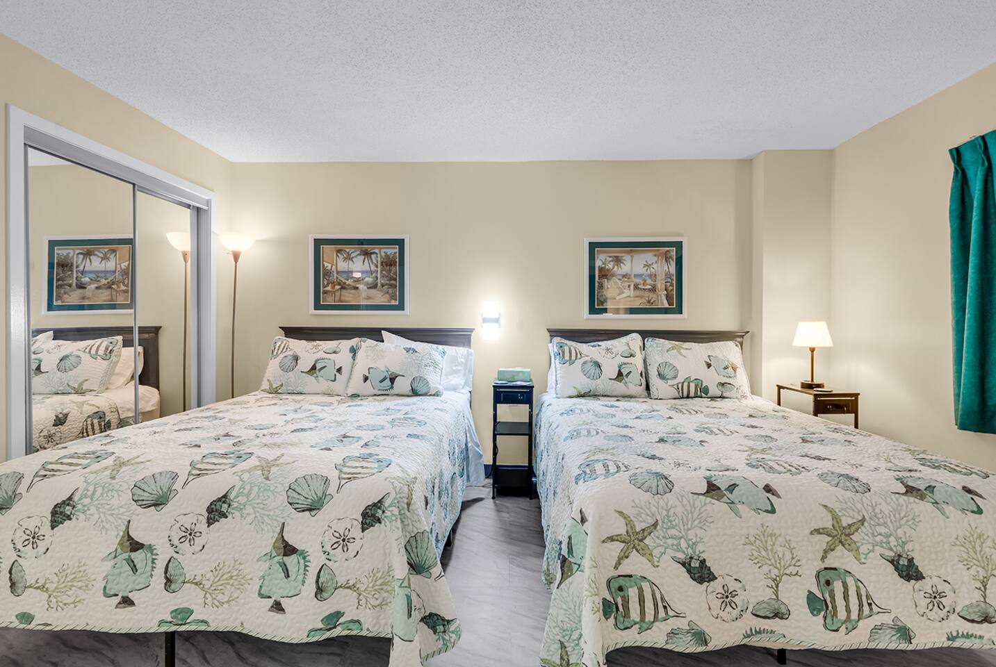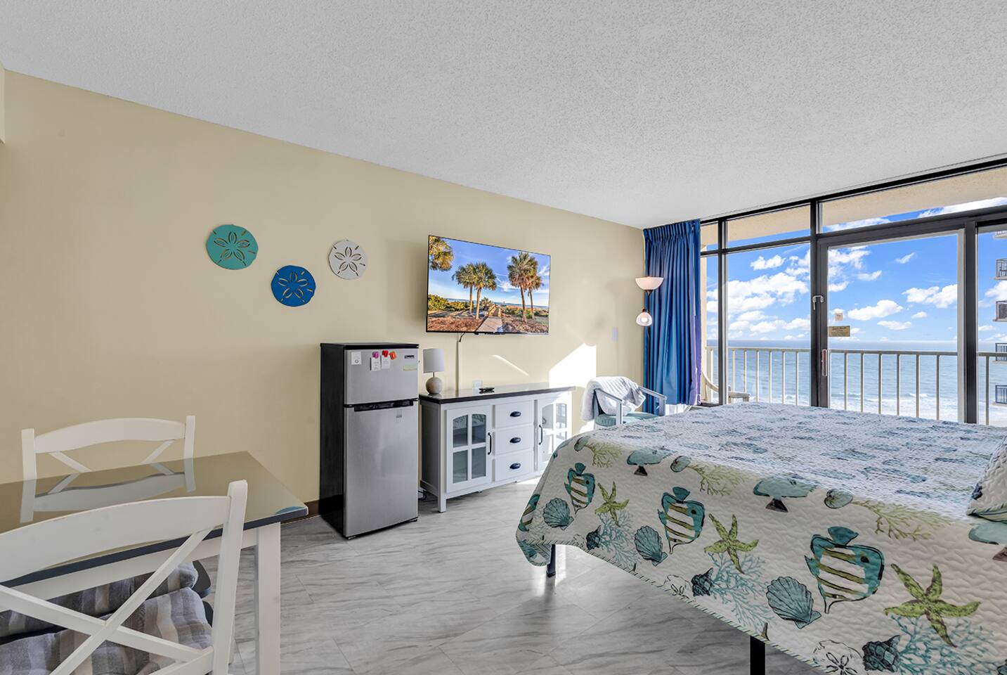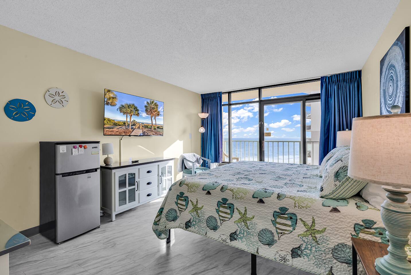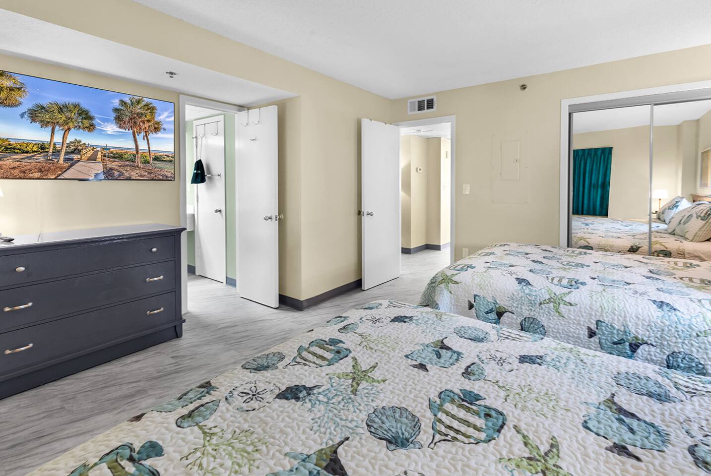 Description of entire space: Located on the 10th floor. Main unit- Living room: Couch, chair, TV, electric fireplace, access to balcony with ocean view, access to lockout unit Dining area: Table that will easily seat 6 Kitchen: Breakfast bar with stools, fridge, stove top (no regular oven), toaster oven, dishwasher, microwave, dual coffee machine (drip or pods) Bedroom 1: 2 queen beds, TV, dresser, closet Bathroom 1: Accessed from hallway or bedroom 1, has tub/shower combo, sink, counter, toilet W/D area: another bathroom sink and counter, stackable washer/dryer Secondary unit- Bedroom 2: king bed, TV, access to second balcony, small fridge, microwave, dresser, small table/chairs, closet, accessed from exterior door or LR in main unit. Bathroom 2: tub/shower combo, toilet, sink with counter space