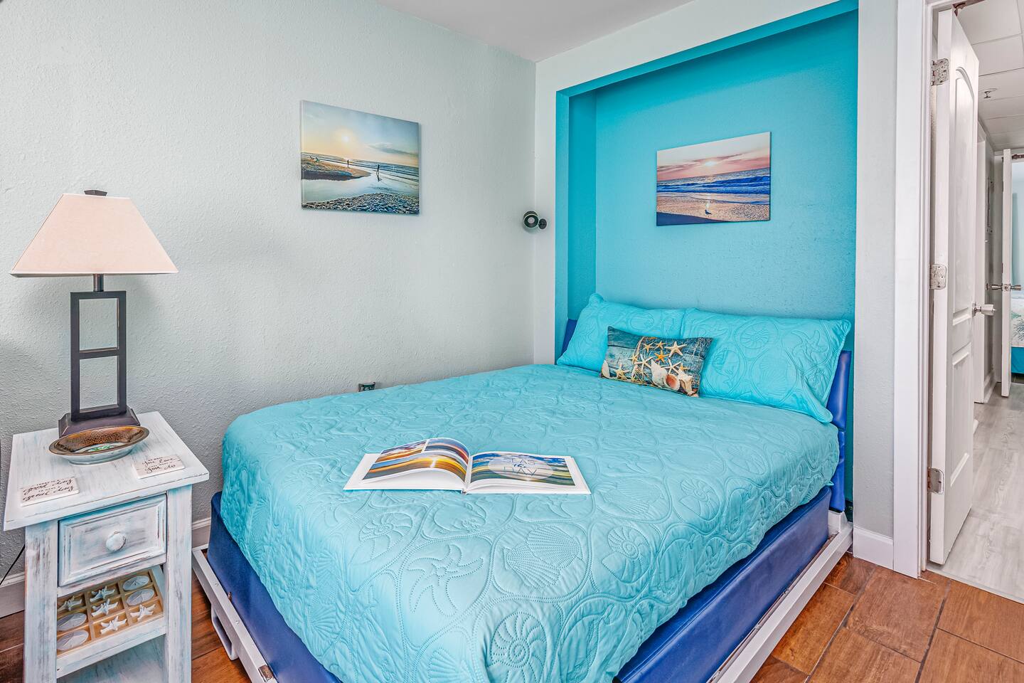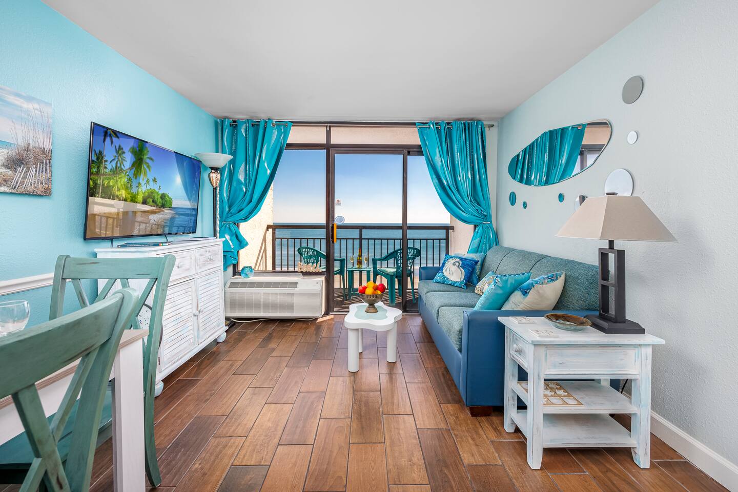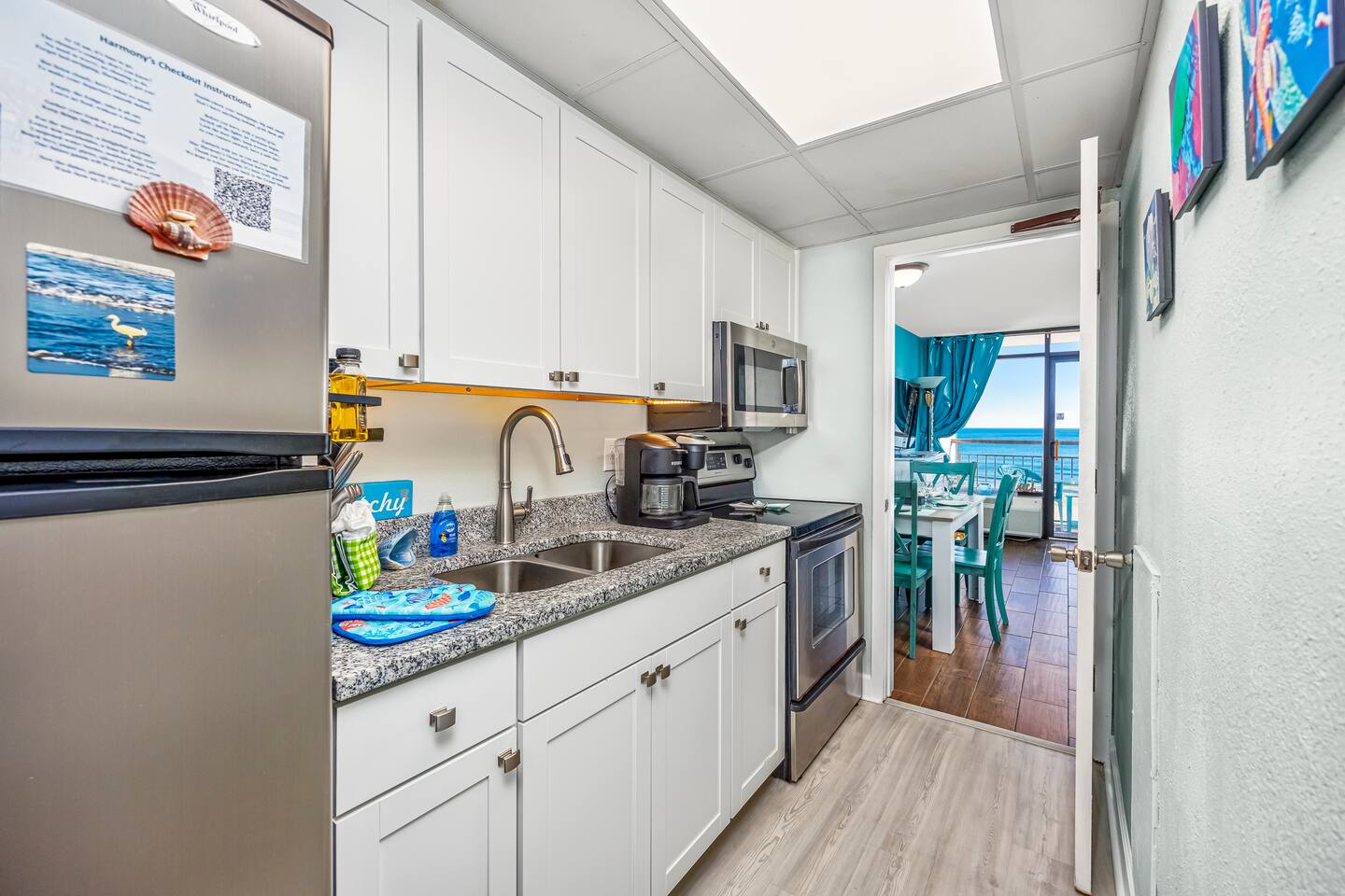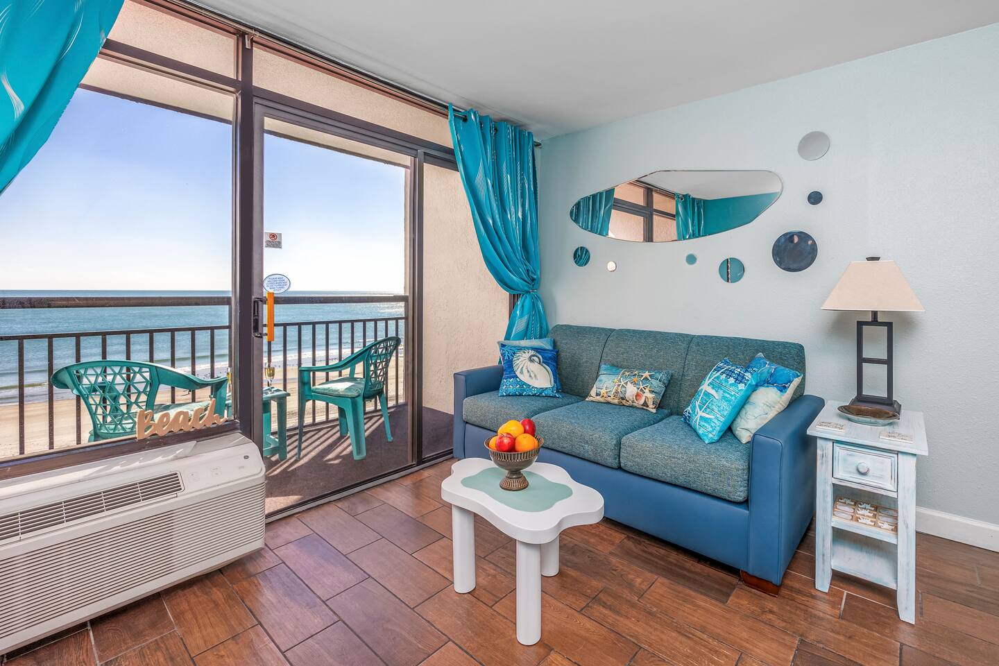 Welcome to Harmony’s Ocean Haven, your beach getaway! From the moment you step inside, you're greeted by breathtaking ocean views that immediately set the tone for a relaxing and refreshing stay. The condo is decorated in soothing coastal blues and teals, bringing the calm and beauty of the sea right indoors. The airy and cheerful living room offers a front-row seat to the ever-changing seascape. You'll find a convenient Murphy bed, an elegant dining area, and a comfortable couch and chair – perfect for sinking in after a day of sun and surf. Whether you're enjoying a movie on the 55” smart TV or debating whether to sneak in just one more beach day (spoiler: the answer is always yes!), this space invites you to unwind. Our fully stocked kitchen has everything you need to prepare your meals—whether you're cooking a gourmet seafood feast or just mastering the art of vacation pancakes. And with the ocean just outside the window, even doing the dishes might feel a little more enjoyable. The bedroom is the perfect place to rest after a day of sun and sand, with two comfortable queen beds, a 55” smart TV, and a dehumidifier to keep things cool and comfortable through the night. All the artwork in the condo is our very own original photography, if you love any pieces, let us know – you’ll seriously make our day! You will find a few beach essentials in the bedroom closet – boogie boards, a cooler, a couple of beach chairs, and an umbrella. There is a selection of books, toys, and games in the living room cabinet for those rainy days. The bathroom features an updated bathtub/shower combination with a dual handheld massage shower, a separate vanity area, and plenty of towels. Step out onto your private sixth-floor balcony – the perfect perch to sip morning coffee, enjoy a romantic dinner, watch dolphins and surfers, or simply breathe in the sea mist. It’s a favorite spot for dreaming, relaxing, or even plotting your new life as a full-time beach bum. Plentiful resort amenities include direct beach access, several pools and hot tubs, including a recently renovated rooftop pool. The poolside Surf Shack offers refreshments and snacks during the season, so you can grab a bite without missing a moment of relaxing in your lounge chair. There are soda and snack machines throughout the resort, plus a fitness room and a laundry facility. Enjoy the convenience of free onsite parking, located just steps away from your condo’s front door. We’ve poured our hearts into creating this special retreat—a place where you can kick off your shoes, breathe in the ocean air, and pretend for a while that cell phones don’t exist. We hope you’ll feel truly at home and experience the same joy, harmony, and peace that this beautiful oceanfront escape brings us. May your stay be filled with unforgettable moments and a touch of seaside magic. Welcome to Harmony’s Ocean Haven! We’re so glad you’re here.