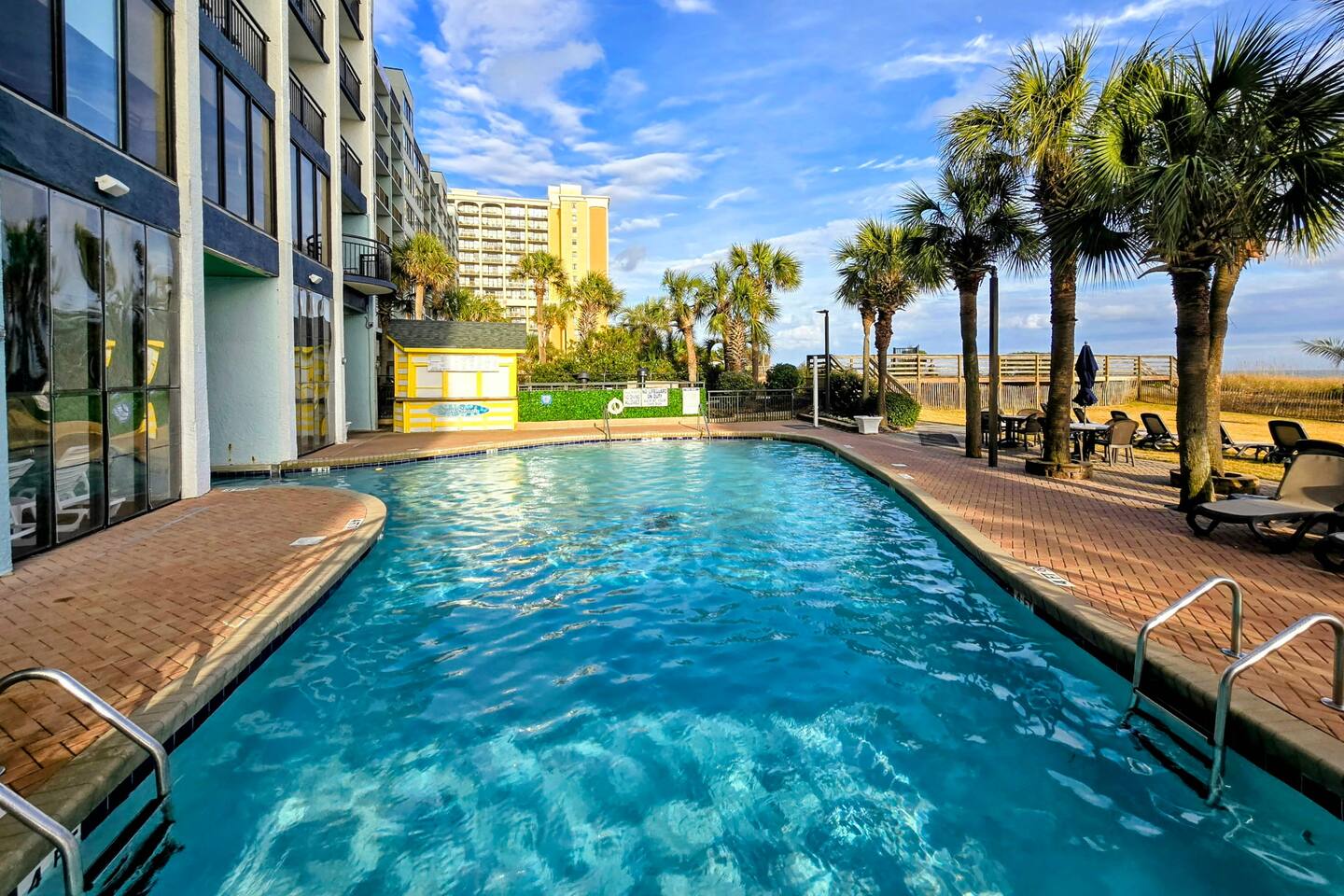 Welcome to Harmony’s Ocean Haven, your beach getaway! From the moment you step inside, you're greeted by breathtaking ocean views that set the tone for a relaxing stay. The condo is decorated in soothing coastal blues and teals that bring the calm of the sea indoors. All the artwork in the unit is our very own original photography — if you fall in love with any of the pieces, let us know… you’ll seriously make our day! LIVING ROOM The bright and welcoming living room offers floor-to-ceiling ocean views and a front-row seat to the ever-changing seascape. You'll find a full-size Murphy bed, an elegant dining area, and a comfortable couch and chair to sink into after a day of sun and surf. Whether you're enjoying a movie on the 55” smart TV or debating whether to sneak in one more beach day, this space makes it easy to relax and unwind. KITCHEN The fully stocked kitchen has everything you need to prepare your meals, whether you're cooking a fresh seafood dinner or just mastering the art of vacation pancakes. With the ocean just outside the window, even doing the dishes might feel a little more enjoyable. You’ll find a refrigerator with icemaker, stove, microwave, drip/Keurig combo coffee maker, toaster, and plenty of pots, pans, cooking utensils, plates, cups, and glasses. We also provide a starter supply of paper towels, dish soap, dish towels, and trash bags, and you’ll often find basic cooking supplies that our kind guests leave behind for others. BEDROOM The private bedroom is the perfect place to rest after a day of sun and sand, with two comfortable queen beds, a 55” smart TV with cable, dresser, and closet. We provide a dehumidifier to keep things cool and comfortable through the night. BATHROOM The updated bathroom includes a bathtub/shower combination with a dual handheld massage shower and a separate vanity area to make getting ready in the mornings a little easier. We supply a hairdryer, a starter set of toilet paper and toiletries, and two sets of towels per guest. BALCONY Step out onto your private sixth-floor balcony — a perfect place to sip your morning coffee, enjoy a quiet dinner, watch dolphins and surfers, or simply take in the ocean breeze. It’s a favorite spot for unwinding… or even imagining your new life as a full-time beach bum. The balcony is furnished with a pair of comfortable chairs and small tables, along with a drying rack for beach towels and swimsuits. BEACH GEAR You’ll find several beach essentials in the bedroom closet, including boogie boards, a cooler, a couple of beach chairs, beach toys, and an umbrella. There is also a selection of books, toys, and games in the living room cabinet for those occasional rainy days. Many of our guests prefer to bring their own pool/beach towels, but if you prefer to pack light, pool/beach towels are available to rent for $10 per towel for the duration of your stay. Just let us know and we will have them ready for you upon your arrival. RESORT AMENITIES Plentiful resort amenities include direct beach access, an oceanfront lawn with lounge chairs and games, indoor and outdoor heated pools, a heated lazy river, and three hot tubs. Don’t miss the recently renovated rooftop pool with beautiful sunset city views. The poolside Surf Shack offers seasonal refreshments and snacks, so you can grab a bite without leaving your lounge chair. Additional conveniences include soda and snack machines, a vending area, a fitness room with oceanfront views, a laundry facility, and free onsite parking just steps from the condo. The resort also provides onsite security and security cameras throughout the common areas. THE HARMONY’S OCEAN HAVEN DIFFERENCE This is my home too during the winter, and I want it to be as comfortable and welcoming for you as it is for me. Every detail has been thoughtfully considered to help you relax, unwind, and enjoy your time at the beach — I’ve done my best to think of just about every necessity that could possibly fit in the condo (and a few that probably shouldn’t! The condo is professionally managed, and as the owner, I stay closely involved to ensure everything is taken care of. Professional cleaning and restocking are completed after each stay, along with frequent quality control inspections. Monthly preventive pest control and annual bed bug treatments are provided by Beach Pest Service. PTAC units and smoke detectors are inspected and serviced annually, along with routine deep cleaning and preventive maintenance. I also make ongoing updates and improvements throughout the year to ensure the space stays fresh, comfortable, and guest-ready. I’m committed to clear and responsive communication throughout your stay. I look forward to welcoming you at Harmony’s Ocean Haven!