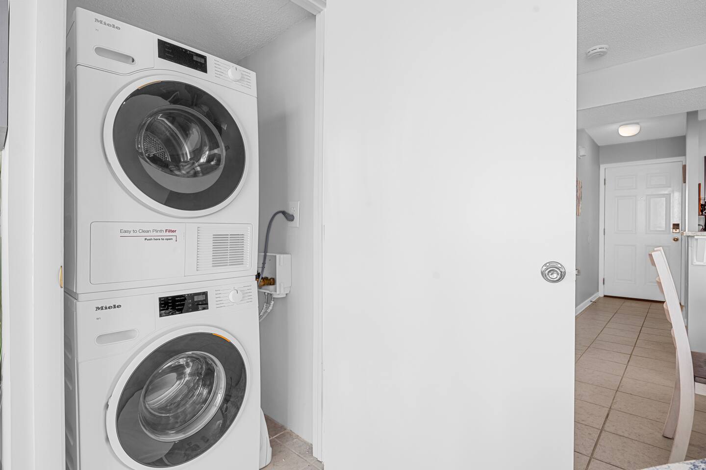 Stackable washer and dryer is brand new. we ask that you keep the laundry closet door open while drying close to help with ventilation. Please also clean lint out after each use. Cleaning fees and damage deposits will be higher for stays of 4 weeks or more.
