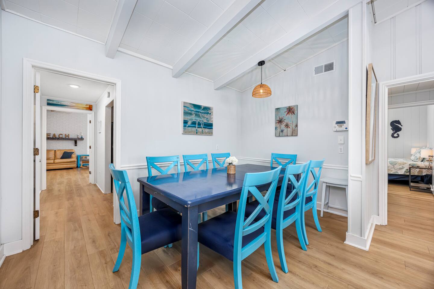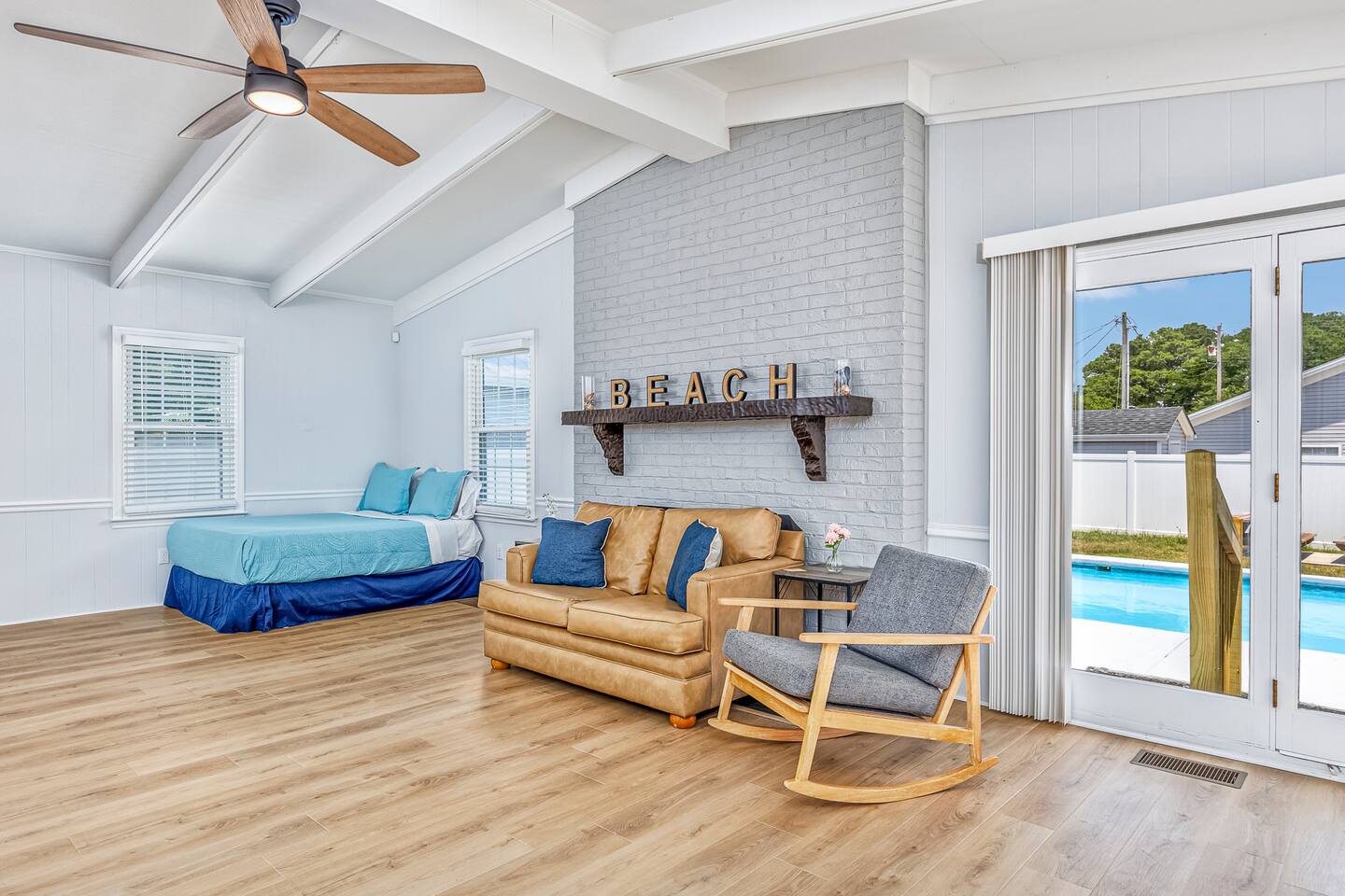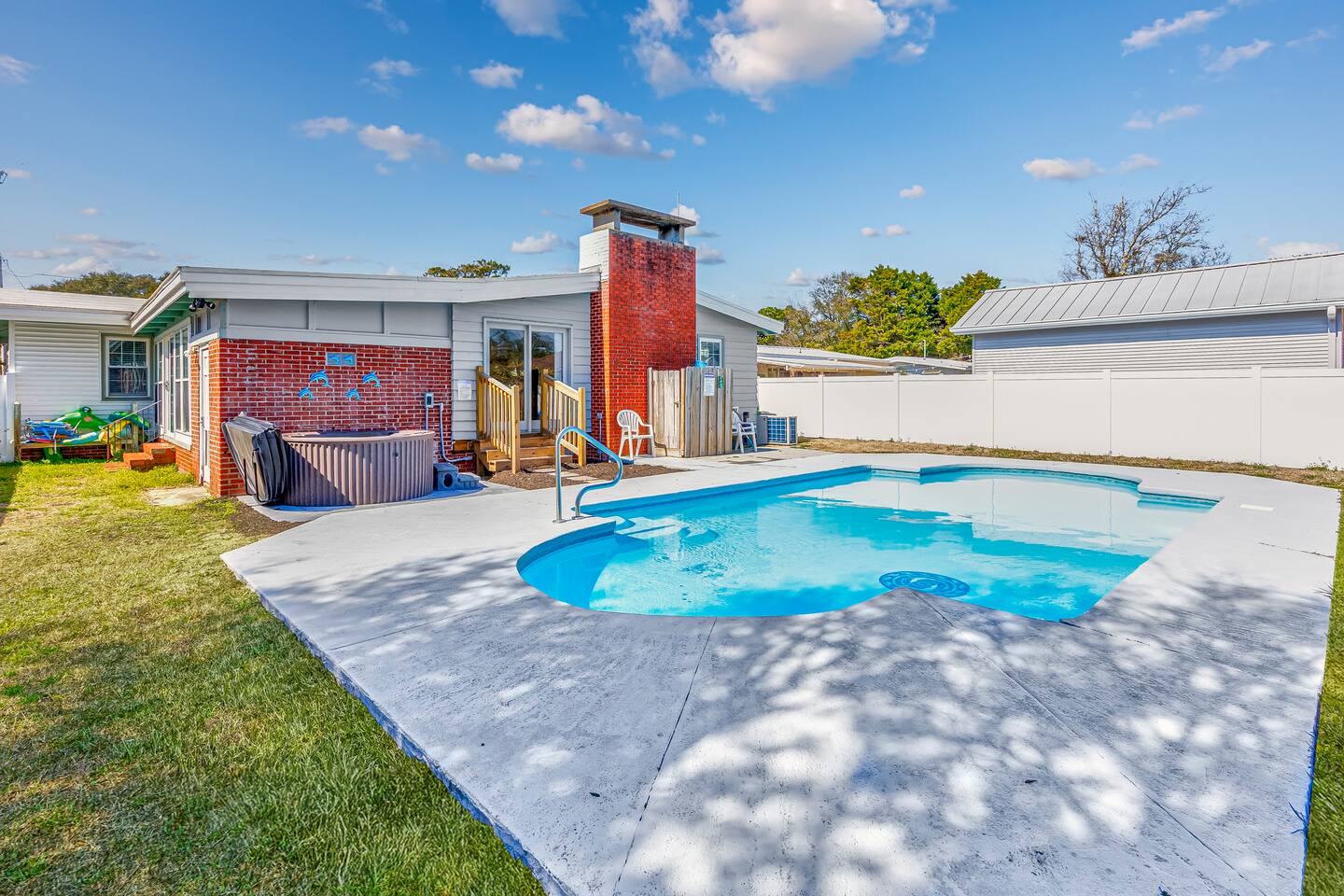 From the outside this home looks like a normal small ranch house, but don't let the fool you! There's plenty of space inside! This ol house has some real charm! From the high arched ceilings with exposed beams to the paneled walls, it's got that classic beach house feel. Skylights, bright and light fun colors, plus lots of windows induce happy vibes! You may even feel nostalgic as memories from visiting the beach as a kid come flooding back! *This is a new listing, and we wanted to get photos up asap. I understand that the place looks a bit bare. When you arrive, there may be more decor- throw pillows, artwork on the walls, more bedside lamps, and just little things to make the home feel more "homey" :) LIVING ROOM: We have a large leather couch and a dual reclining loveseat for your comfort. There's a large flat screen TV mounted on the wall, skylights and a ceiling fan! DINING AREA: The dining area comfortably seats 8. We have an extra leaf and some extra chairs as well for the larger groups who like to all sit down for a meal together. KITCHEN: All new stainless steel GE appliances, including dishwasher. The kitchen is fully stocked with dinnerware and pots and pans for cooking. LAUNDRY ROOM: Fairly new washer and dryer. This is where you will also find the extra table leaf. BEDROOMS: Each bedroom has a flat screen TV with streaming options. Please note you must log in to your own accounts. We do not offer cable, but there are some free roku channels, etc if you don't have any streaming accounts. There are ceiling fans in each room. There is one bed per most rooms. One king bedrrom. Total of 3 queen bedrooms (one is a sleep number with adjustable firmness). One room has 2 queen beds. In the 5th bedroom there is a full size bed (this may be switched to a day bed with trundle in the future). It also has a loveseat, futon, and a rocking chair. Please note-you can shut the doors for privacy but the backyard is accessed through this room. It's a rather large room and can double as a family room. We may add more sleeping space to the 5th bedroom in the future. YARD: The backyard is fenced in with a large inground pool and a hot tub to enjoy. It's big enough to bring your yard games, too! We also have a couple of picnic tables if you want to eat outside. BATHROOMS: There are two bathrooms- one with a shower (recently updated) and the other has a tub/shower combo. It's a bit outdated, but functional! Throwback bathrooms can be fun though, right? Who doesn't love peach colored tile?! Things to note: ENTRY: You must climb steps to get into the home. SAFETY: Families are welcome, but the home is not baby-proofed. Bring your own safety devices and keep children out of rooms with free-standing closets. And of course watch them in the yard! There are some steps up or down to get into some of the rooms so keep that on mind, especially when choosing which bedroom to stay in. COMFORT: We have central heat/air in most of the house. Two of the bedrooms have their own heating and cooling devices (wall unit in one room and portable A/C unit in the other). POOL: Please read and abide by pool rules posted outside. No running, diving, horseplay, no glass anywhere near the pool. No food in the pool. Use swim diapers on babies/children who cannot verbalize the need to get out and use the restroom. There is no lifeguard therefore you and your group will be swimming at your own risk. No children under the age of 14 or people who cannot swim should be allowed in the pool unless supervised by an able-bodied adult who can swim. If you are staying in the colder (fall or spring) season and want the pool heated, we can offer that option for $25/day (all booked nights will count as 1 day). The heater will not be sufficient in the winter. HOT TUB: Pool rules apply for hot tub as well, Read and abide by hot tub rules posted outside. No unattended children in hot tub. QUIET HOURS: 11pm-7am. This home is located on a residential block with full-time residents on either side. You must be respectful of quiet hours. SET-UP OF HOME: This home is unique and all 5 bedrooms can be private, however the 5th bedroom is unique. Doors can be closed to make it private, but typically that room will be used to access the backyard. It won't be an ideal sleeping space for someone who goes to bed early, or if others are still going in and out of the backyard. PETS: We welcome up to two dogs, but we must approve them first. They must be UTD on shots. No aggressive breeds (full bred or mixes of: Pit Bull, Doberman, Rottweiler, German Shepherd, Aikita, Husky, Chow, Wolf or Wolf-Dog Hybrid, Alaskan Malamute, Great Dane, St. Bernard, Rhodesian Ridgeback, Stafford Terrier, Bull Mastiff, any attack, non-domesticated or guard dogs are NOT covered by our homeowner's insurance therefore won't be accepted). If you have one of these breeds and carry liability insurance on your dog, please send proof with request. We may also make an acception if you sign a document accepting all liability for your dog, along with semding us a valid ID. The dog(s) must be housebroken. If you are found bringing in an unauthorized pet, the pet fee will be doubled. If the pet is considered a nuisance, aggressive breed, or more pets than allowed are found to have entered the home- your stay could be cancelled without refund. Please see house rules regarding pets. Sorry. we will not be accepting cats or any exotic, farm or other animals at this time.