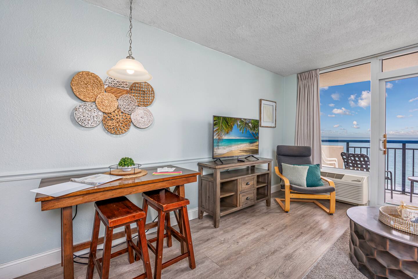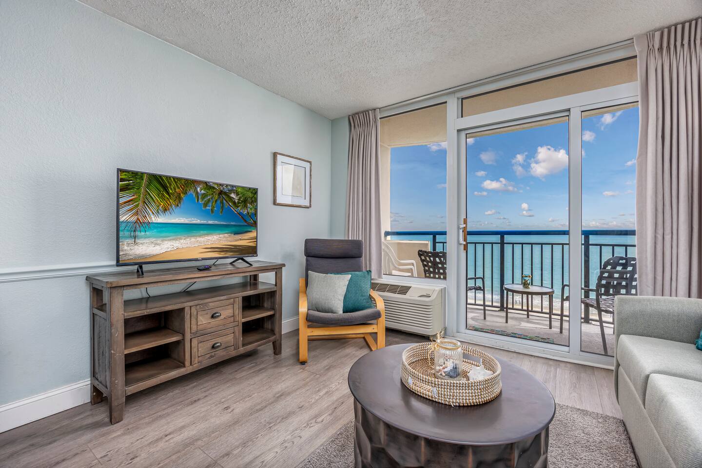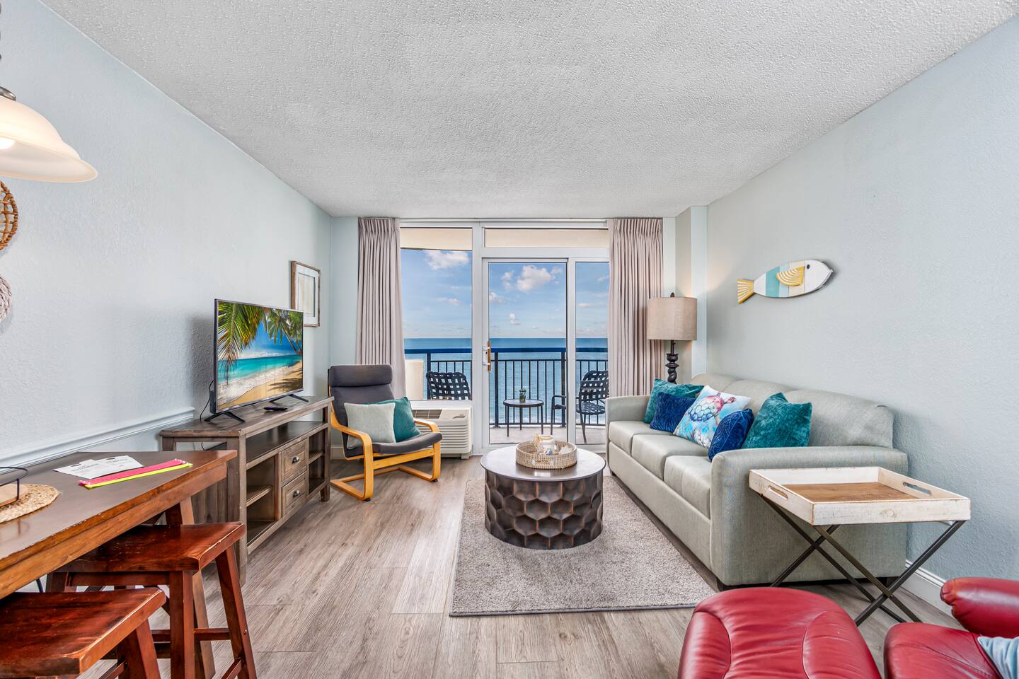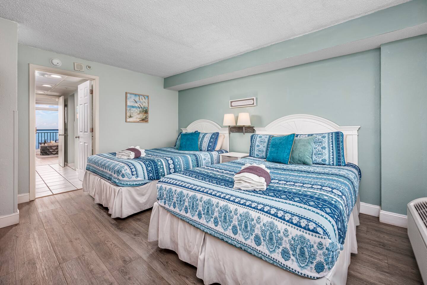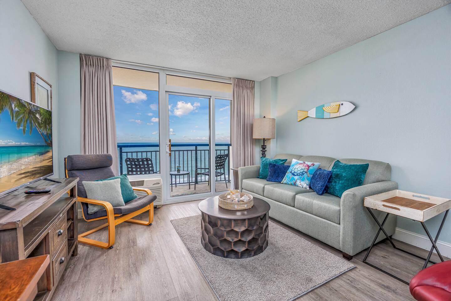 ⭐What's to Love⭐ -Gorgeous Oceanfront Views From a Private 7th-floor Balcony -3 pools (HEATED indoor pool), 2 hot tubs, and a lazy river -Walking distance to restaurants, bars, the Boardwalk, Pier 14, and the notorious Sky Wheel -Full-sized kitchen stocked with the essentials -FREE high-speed wi-fi -FREE on-site parking and parking garage (2 spaces) The Space This condo features the living room on the ocean side of the building. If you sleep in the murphy bed, you can wake up to views of the ocean! Unlike some units, our condo features interior doors on both sides of the galley-style kitchen, which allow privacy in the bedroom and/or living room while maintaining access to the kitchen and bathroom for other guests. ⭐Highlights⭐ -Professionally cleaned between each guest -2 queen beds and 1 murphy bed -Flat screen smart TV in living room. Flat screen cable tv in bedroom. -Free high-speed wi-fi -Full-sized kitchen stocked with the essentials -Linens, starter pack of trash bags, paper towels, etc. are provided -Hair dryer, soaps, shampoo, and more. See the full list of amenities!