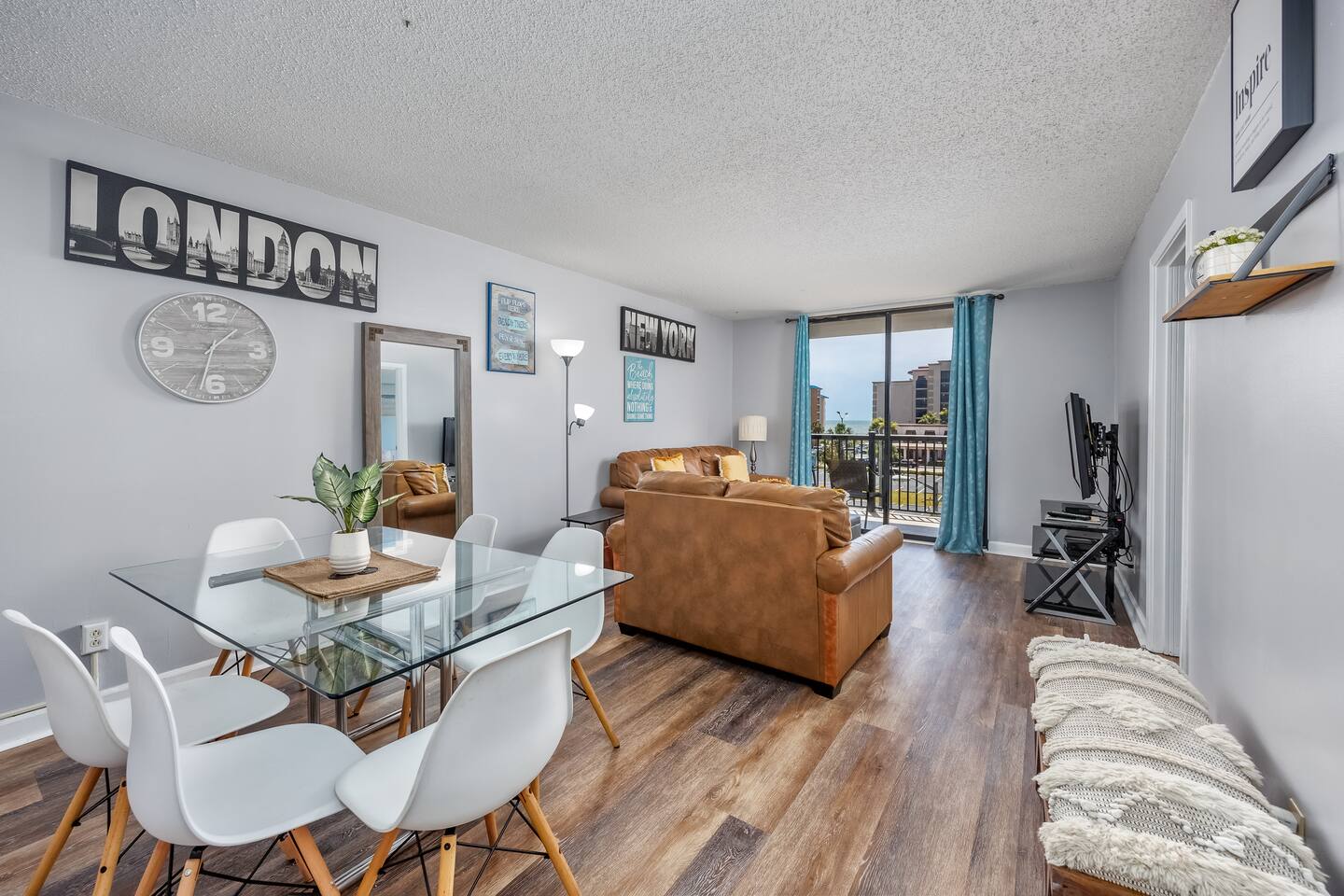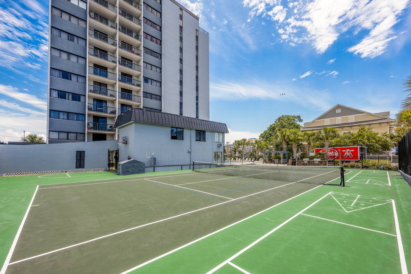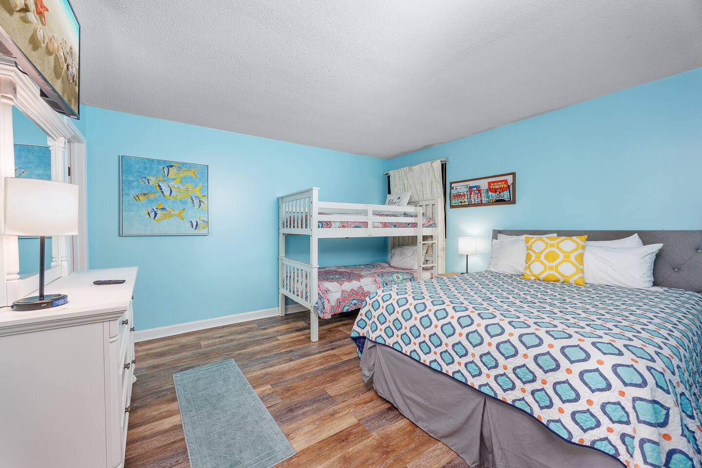The primary bedroom features a king bed, and the secondary bedroom features a set of bunk beds (single over single) and a queen bed as well. If you have kids (or adults) that don't like to share a bed, there is a pull-out sofa bed as well! Holiday Towers has outstanding amenities, including a fabulous swimming pool, outdoor jacuzzi, as well as an indoor jacuzzi. You will experience all of the finest in outdoor amenities, including a tennis court, and outdoor grills and an area to hang out with your friends/family! You will be 3 minutes away from the Myrtle Beach boardwalk, the Myrtle Beach Skywheel, and all of that which makes the Grand Strand what it is. Broadway at the Beach is less than 10 minutes away, and the Myrtle Beach International airport is less than 15 min away. Your whole group will enjoy easy access to everything from this centrally located place!