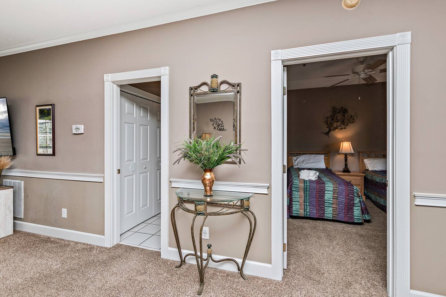 Located in Magnolia North at Myrtlewood Golf Club. The primary bedroom has a king bed and en suite with shower/tub combo. Small closet, dresser, smart TV. The secondary bedroom has two twin beds with a closet , dresser, smart TV and access to the main bathroom which features a shower/tub combo as well. If you have a family of 5-6, you may utilize the pull out sofa bed for extra sleeping space. There's plenty of room on the couch and at the dining table for the entire group to hang out together! The balcony is spacious as well, with seating for 4. From the balcony, you can see the seasonal community pool. There's a keyfob hanging by the front door for entry, along with pool bands, which should be worn while at the pool (please don't lose them, as we have to pay to replace them and will unfortunately have to pass that fee along to the guests).