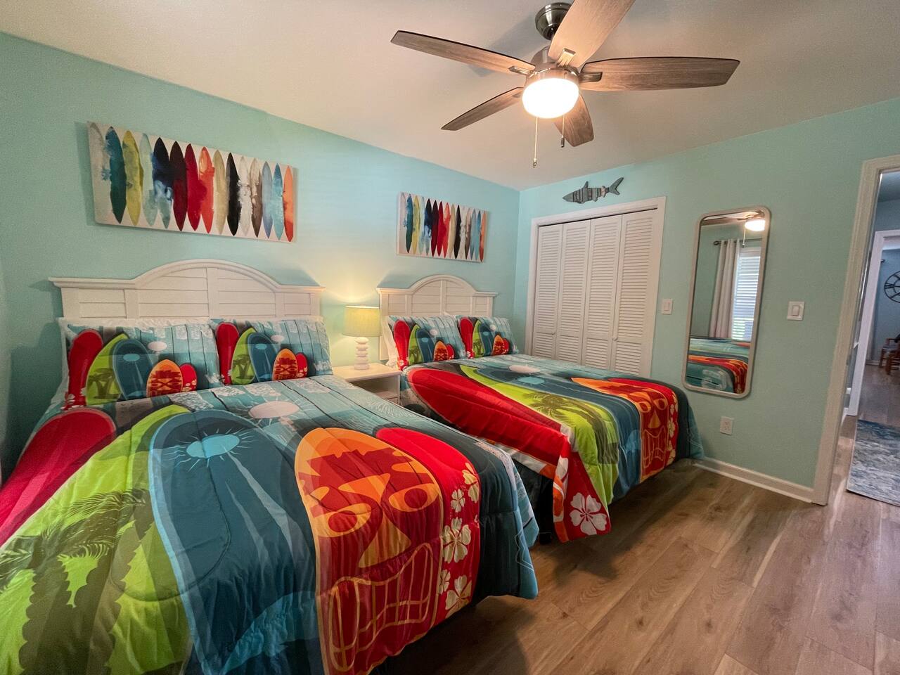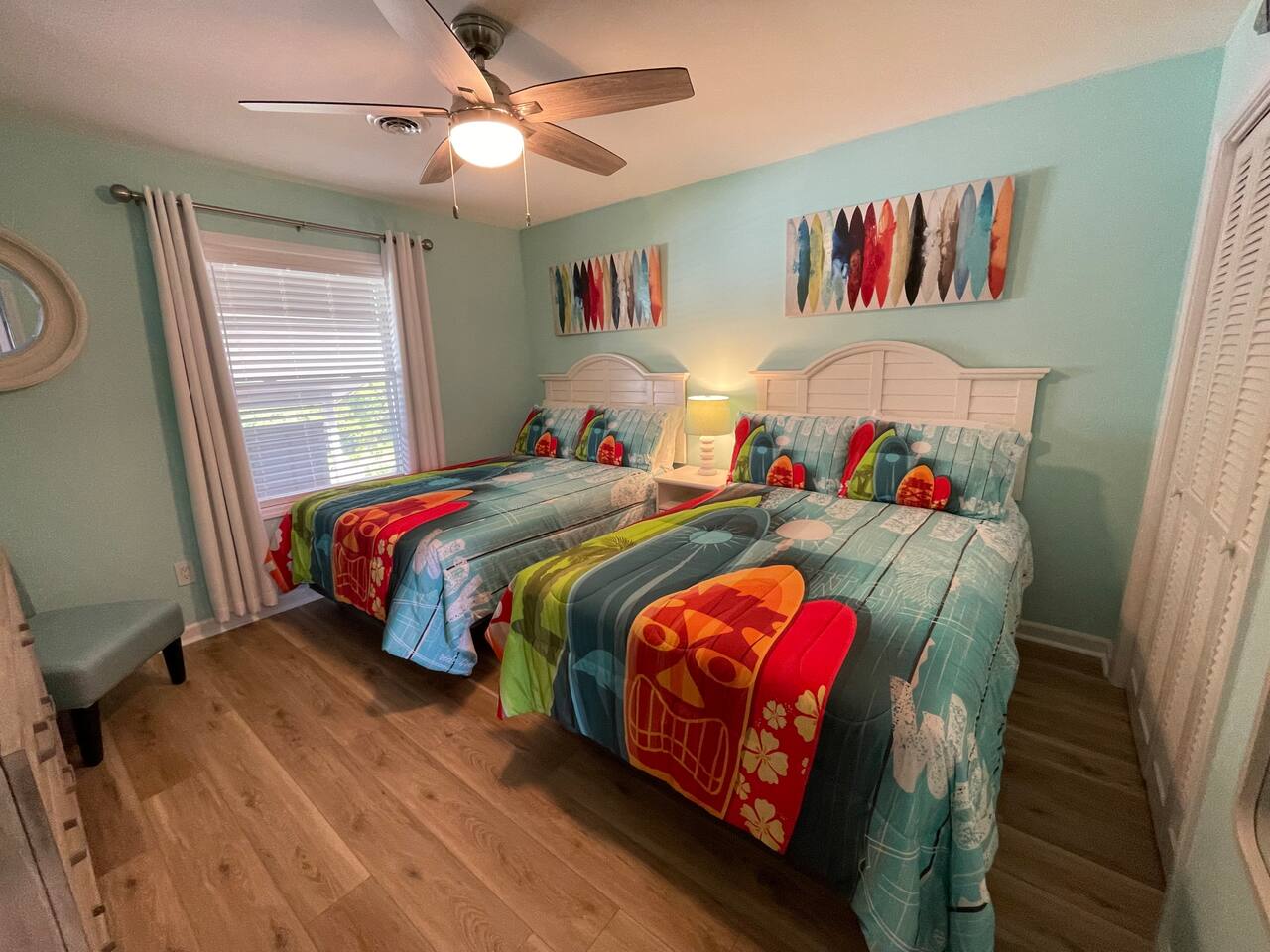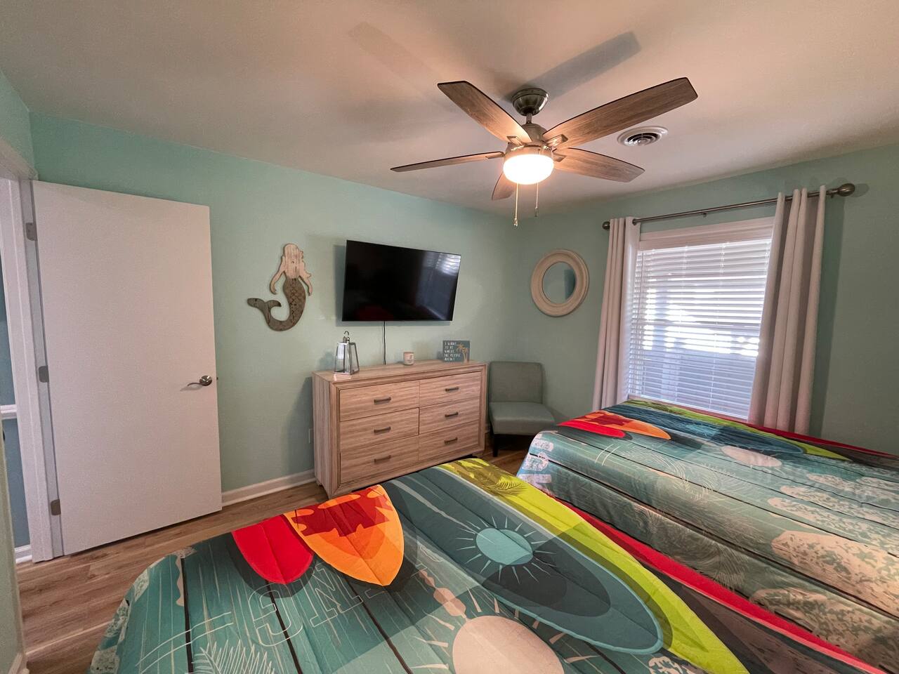 The primary bedroom features a king bed, TV and en suite. The secondary bedroom has a fun theme with 2 double beds and a TV. Roomy living space, kitchen has a breakfast bar. The large balcony is a great place to chill out and people watch or gaze across the street at the ocean.