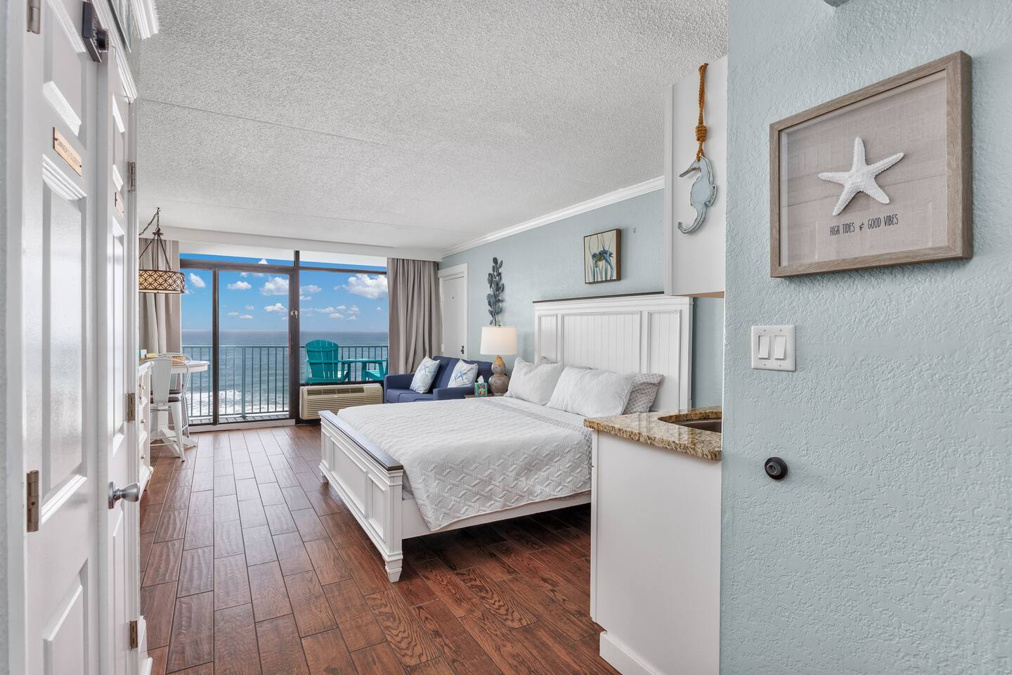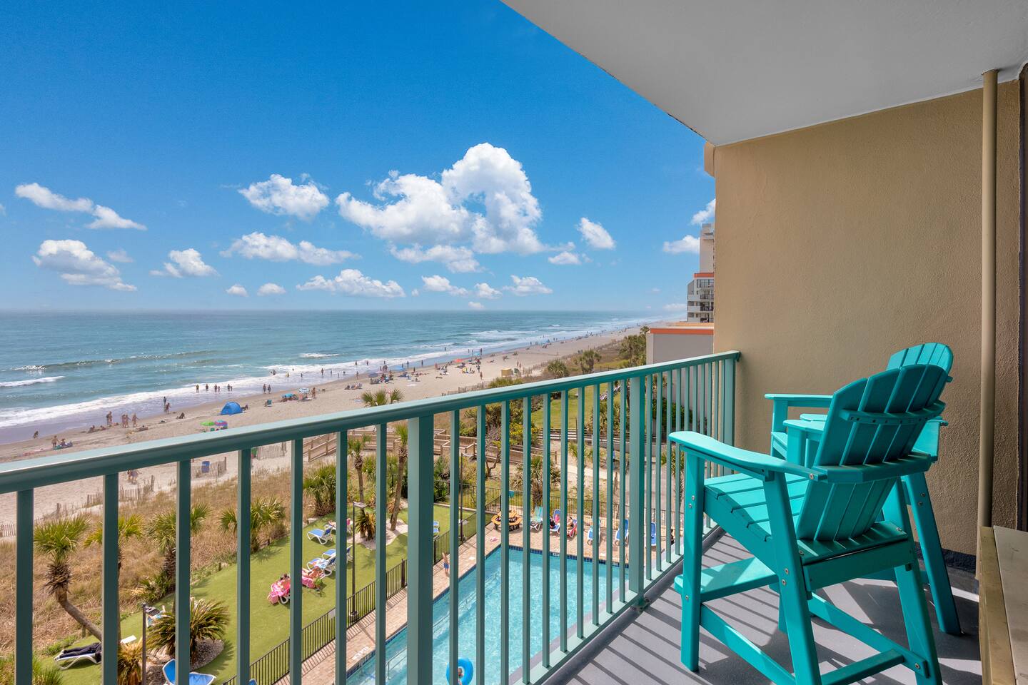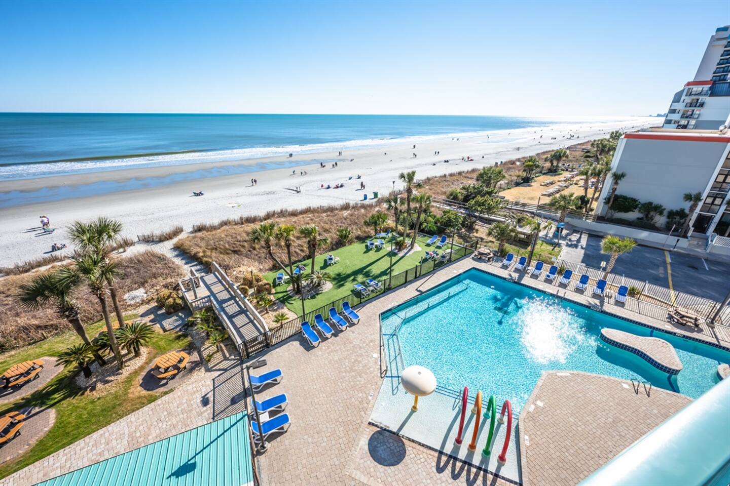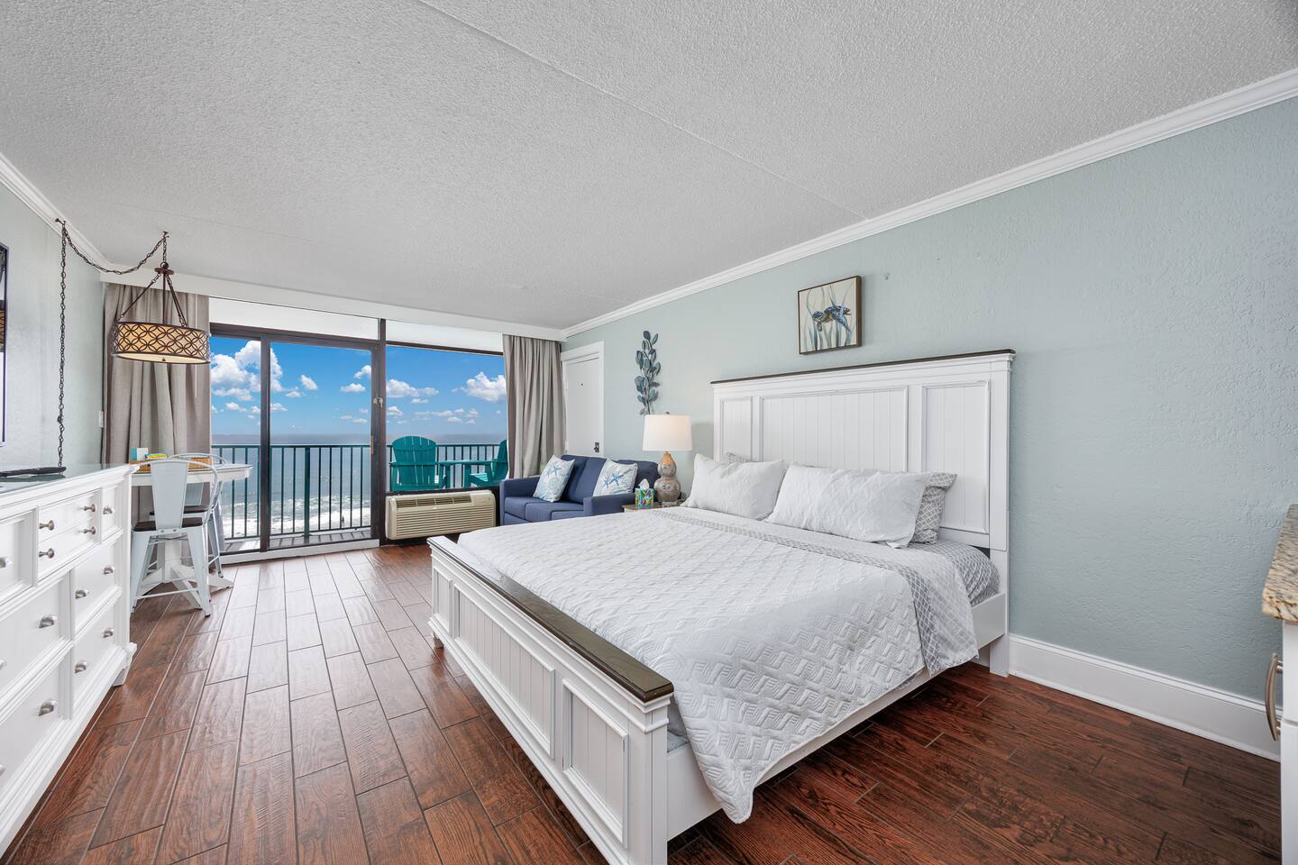Located in Sand Dunes Resort on the 5th floor, you’ll enjoy sweeping views of the beach, ocean, and pool area from your private balcony. With a king-size bed and a queen-size sleeper sofa, there’s enough room for 4 people to sleep comfortably.