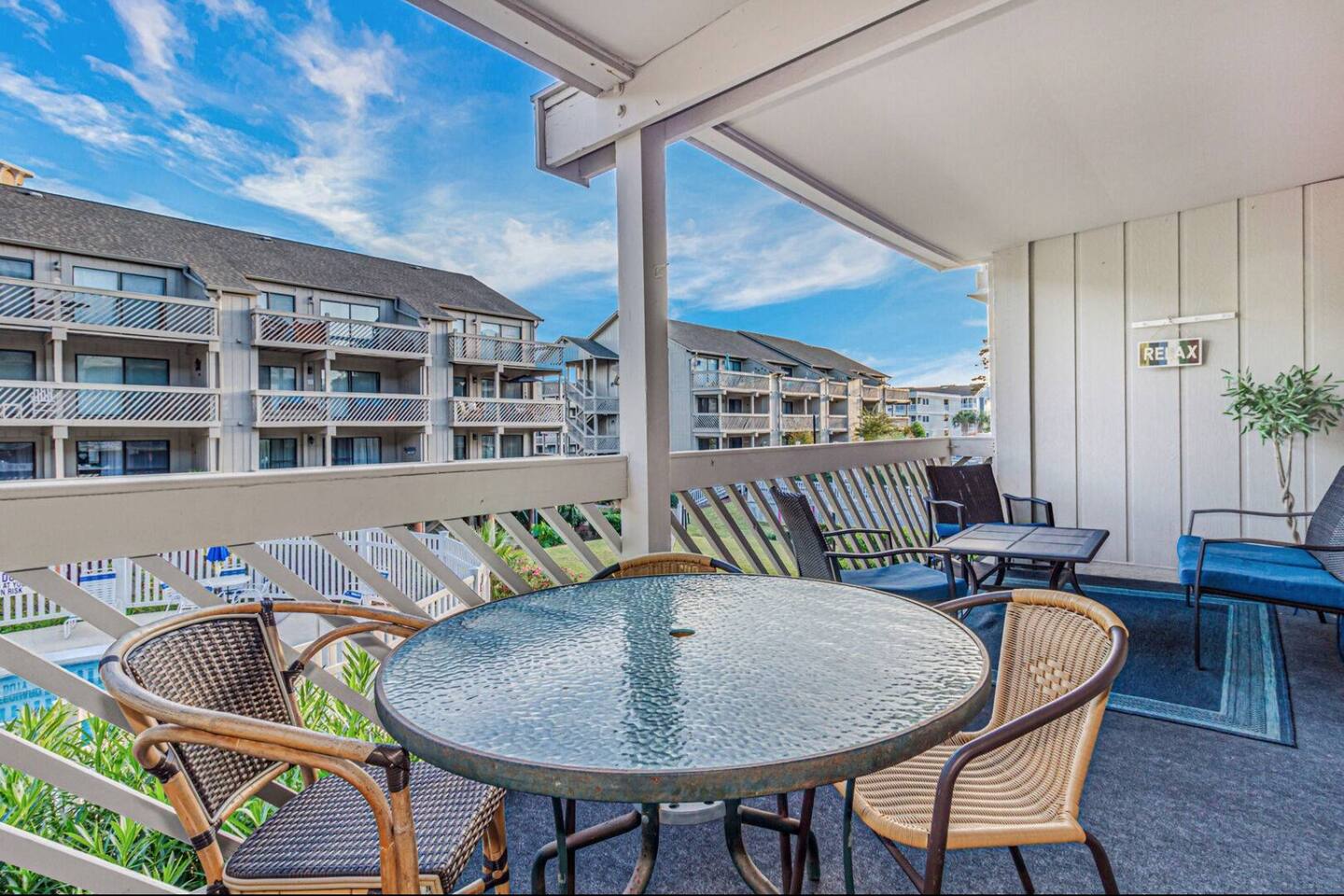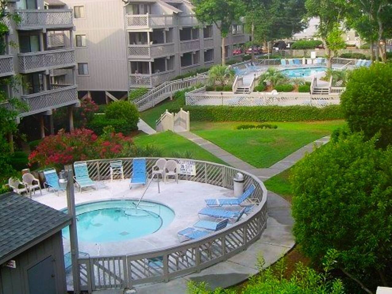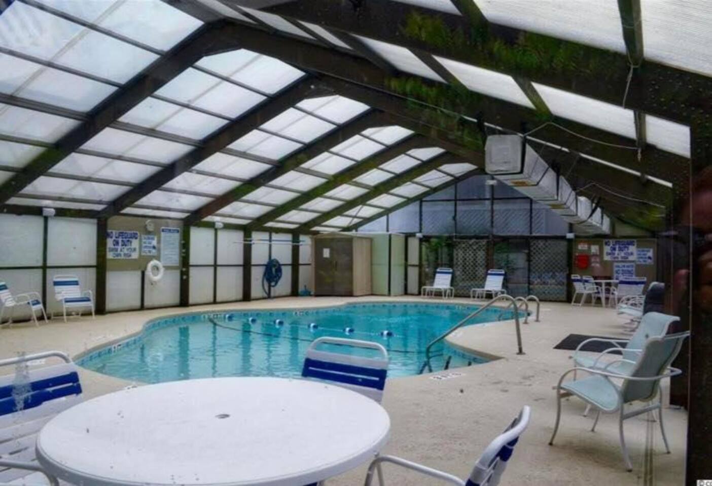 2 bdrm, 2 bath. Nicely equipped kitchen, washer/dryer. First floor. The community is a short one block from the ocean. 840 heated square feet with a deep balcony that runs across the entire width of the unit. The balcony overlooks the courtyard that includes an outdoor pool, a hot tub, an indoor heated pool, and grills for guests to use. The heated pool is a wonderful attraction for guests that visit during the winter months. There are beach toys, beach chairs, and a wagon available to use.