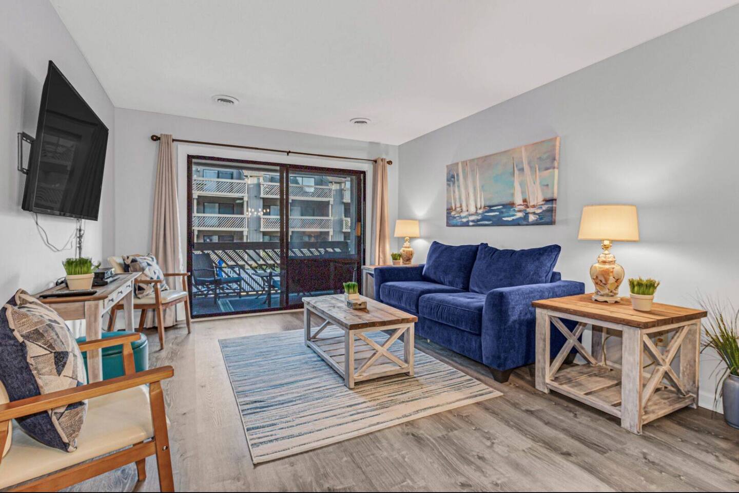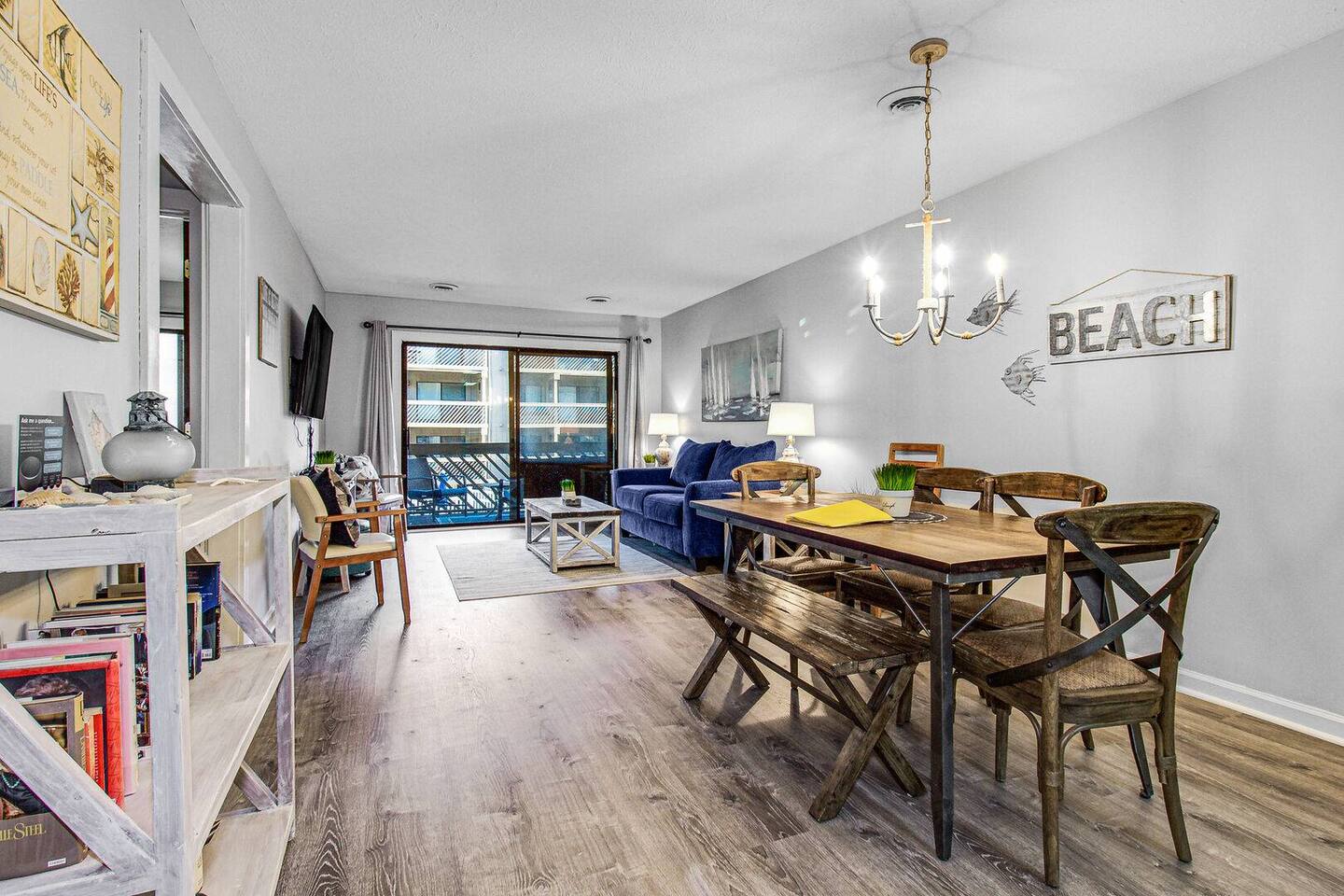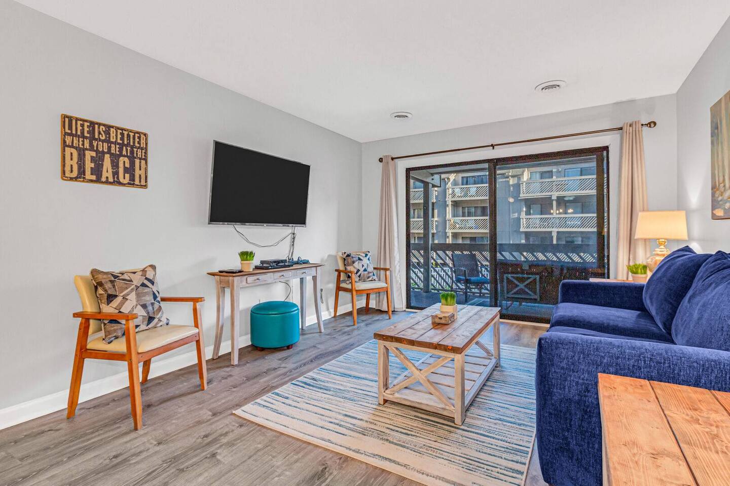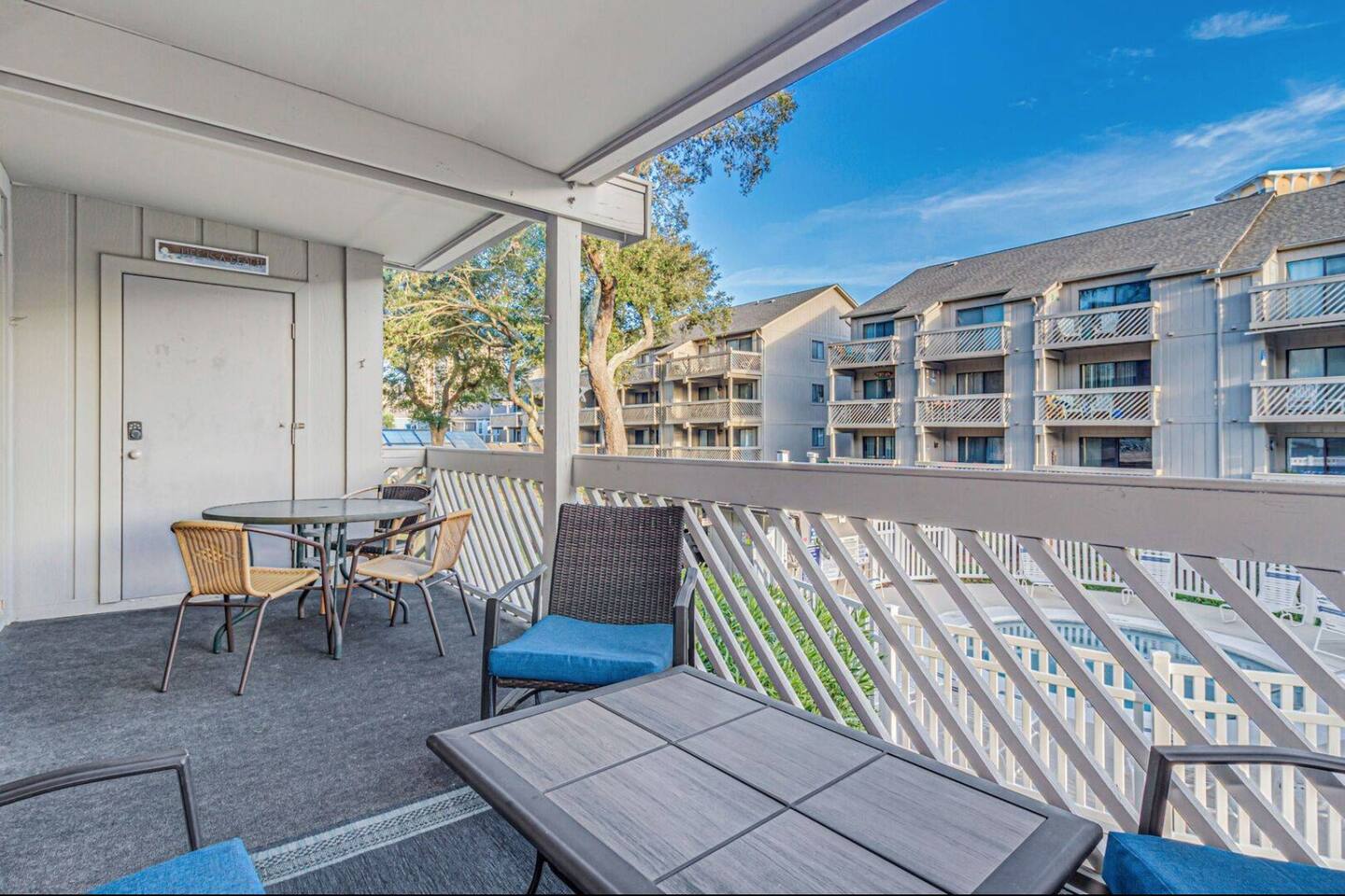 2 bdrm, 2 bath. Nicely equipped kitchen, washer/dryer. First floor. The community is a short one block from the ocean. 840 heated square feet with a deep balcony that runs across the entire width of the unit. The balcony overlooks the courtyard that includes an outdoor pool, a hot tub, an indoor heated pool, and grills for guests to use. The heated pool is a wonderful attraction for guests that visit during the winter months. There are beach toys, beach chairs, and a wagon available to use.
