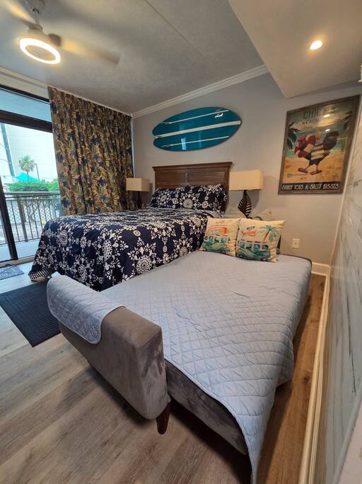 The condo is set up shot-gun style. When you walk in, you will be in the bedroom. There is a door to shut the bedroom off from the rest of the unit. Through the bedroom is a full kitchen. The bathroom off to the side of that (shower/tub combo). If you walk all the way through the galley style kitchen, you will come into the living space where you will find a dining table/chairs, a futon couch, and another queen bed. The balcony is off of this room, where you can watch the waves and feel the wind come off the ocean.